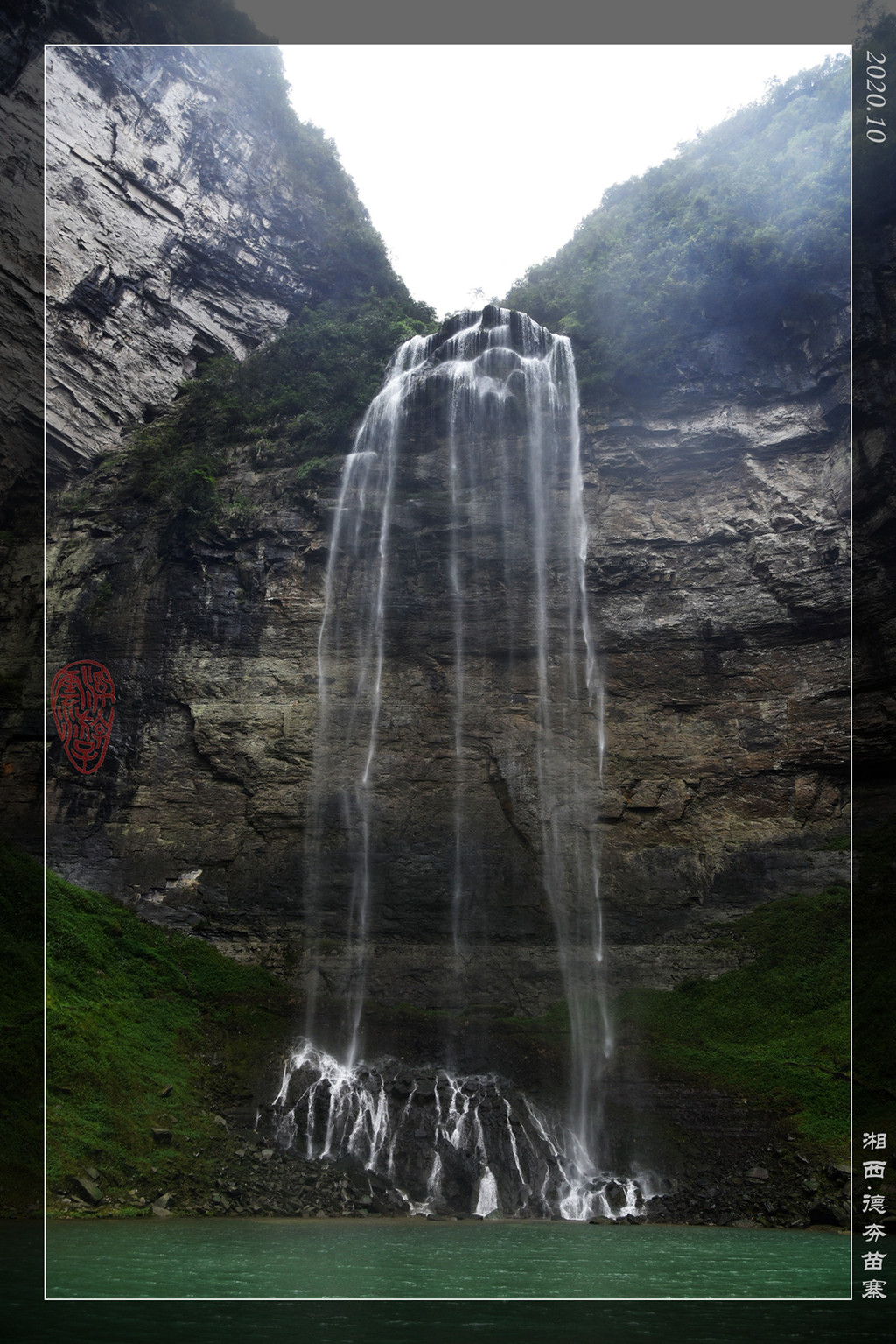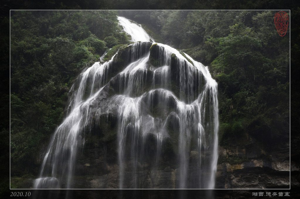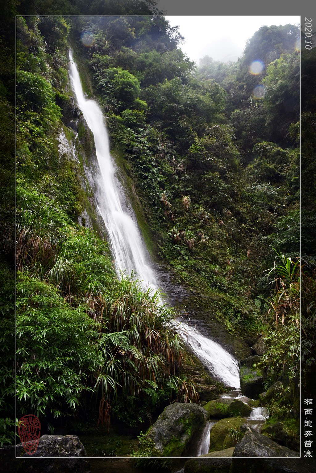 苗寨房子临溪而建,沿着溪水往上,就是九龙溪峡谷,前半段修了路,有游览车可坐,省了不少脚程。然后继续溯溪而行,两岸依然是山高林密,但山路平坦,不算难行。走十分钟,拐过一个弯,突然看到一道几百米宽的石壁立在前方,一道轻柔的瀑布无声无息的从天而降,直落两百余米,瀑布上方被岩石分隔成几道岔流,底端又落在岩石上,依然分成几股汇入一汪碧绿的潭水中。当时游客稀少,雨丝和瀑布溅起的水汽被微风吹到身上,四周寂静仅闻一点轻微的水声,有一种如入仙境的幻觉,美的让人窒息。女儿说,看到瀑布的第一眼觉得是仙女身上的白色轻纱,而这瀑布确实就叫流纱瀑布,被列入中国十大最美瀑布之一!我上上下下拍了一堆照片,却没有一张能拍出身临其境的震撼和感动……