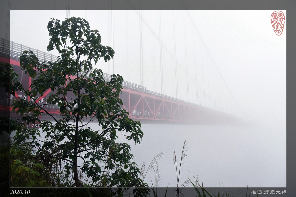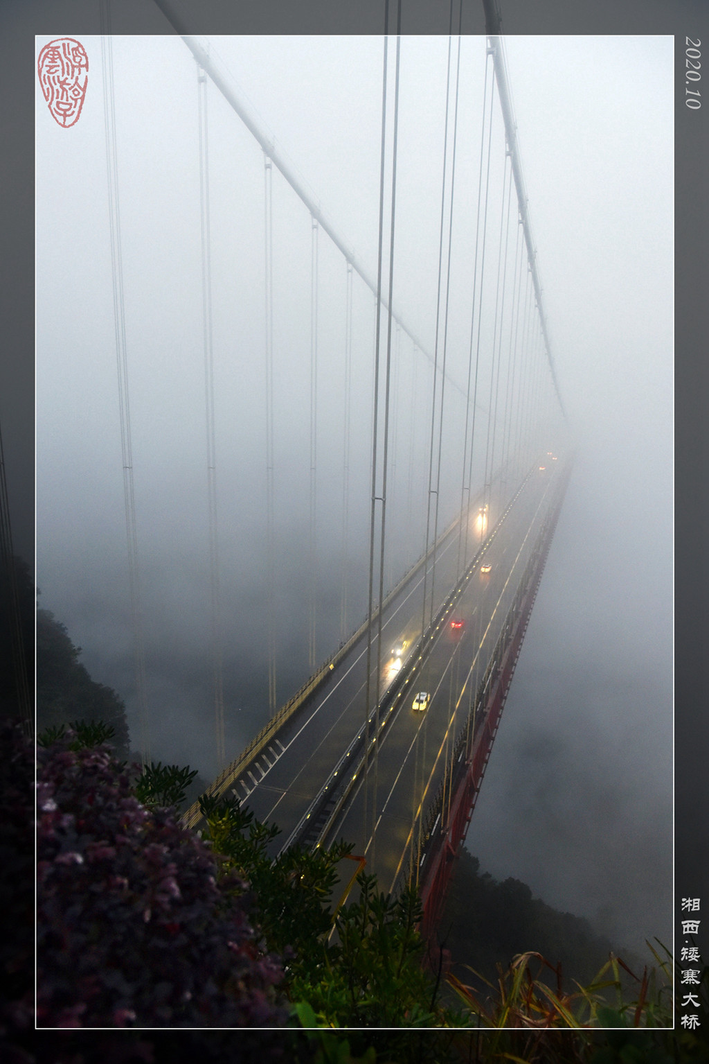 在桥上慢慢走着,天也完全黑了,经过桥面的车灯亮起,穿梭在大桥两端,一盏盏明亮的雾灯穿透暮色浓雾,断断续续的连成一条直线,勾画出大桥的线条,反而比白天能看到的桥面延伸的更远。我们驱车再次从桥上经过,成为断断续续灯火组成的长桥中的一环,穿过阵阵团雾,驶向凤凰。