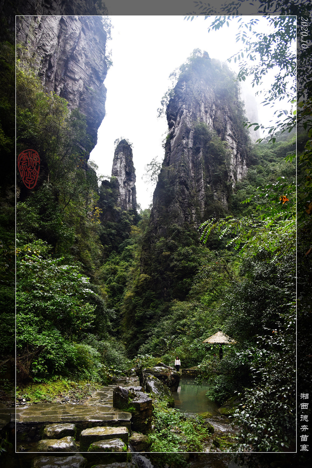 德夯大峡谷另外还有一条玉泉门峡谷,终点是问天台,看网上照片,是一座山峰顶端一个十几平米的平整石台,站在台上,群山簇拥,四顾无余,顿生向天再借五百年的豪情,心向往之。回到苗寨往另外一个方向走,同样有游览车送到山脚下,却没有九龙溪峡谷那么轻松了,走过玉泉门的石碑,有个路牌指向前方写着问天台还有300米,心中一喜,加紧脚步冲上去,几个三百米过去,把一条溪水来来回回跨过几十次,还只在半山腰。心中开始沮丧,天色越来越晚,看着石阶向上漫无终点,妻女被远远甩在后面,想着还要在天黑前赶去矮寨大桥,而如此云雾即使上了问天台也看不到什么了,于是在一条瀑布前休息片刻就折返了。没有登顶问天台,终有些遗憾。