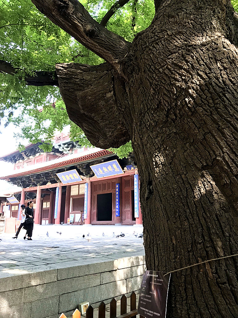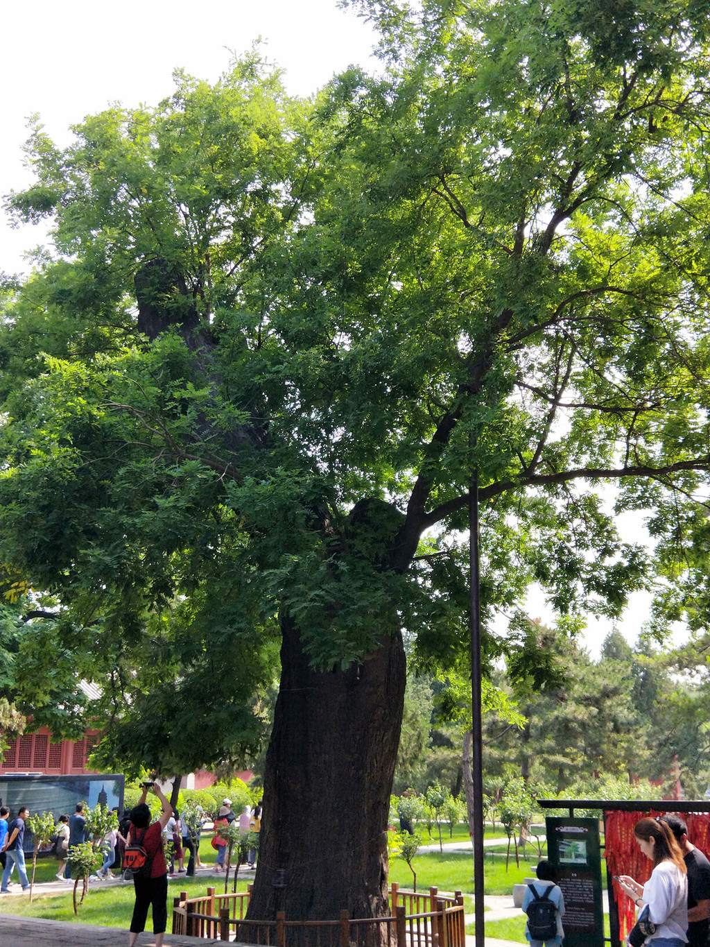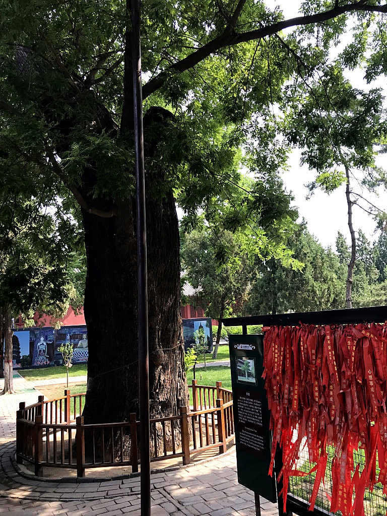 寿龄一千六百余年的槐树,一为龙槐,一为凤槐。这对古槐树冠在空中相通,树根在地下缠绕,国运衰则叶稀,国运盛则叶茂。人们感知龙凤槐的灵性,若绕树三匝,相信会有福报。