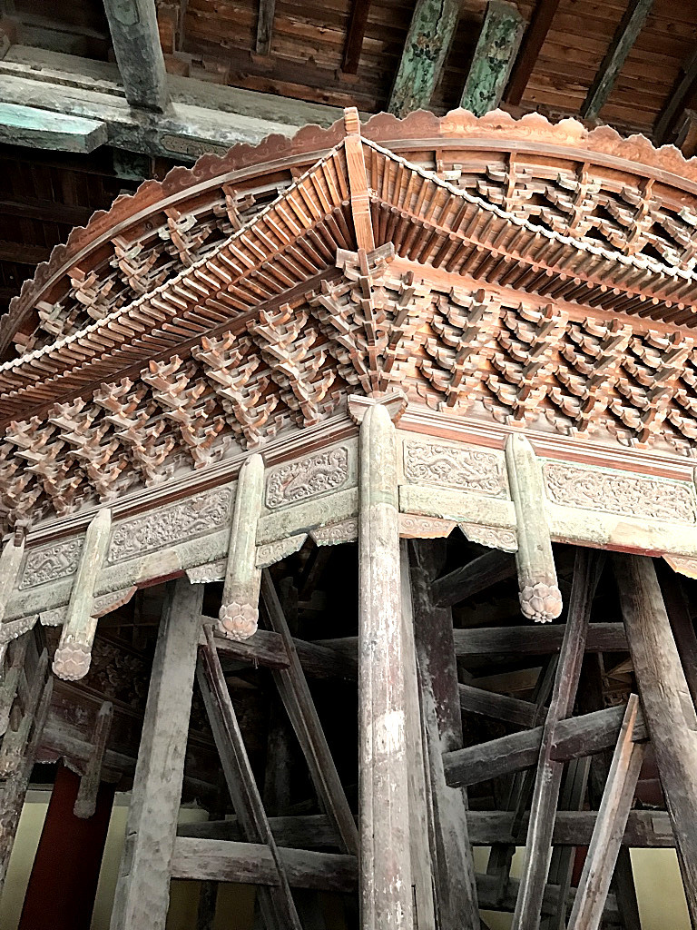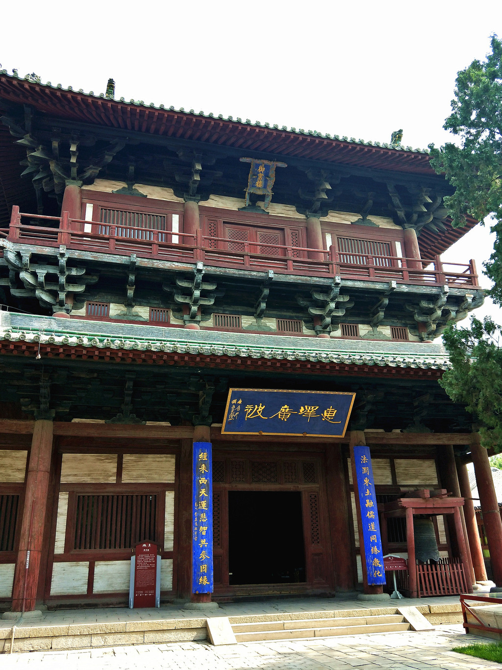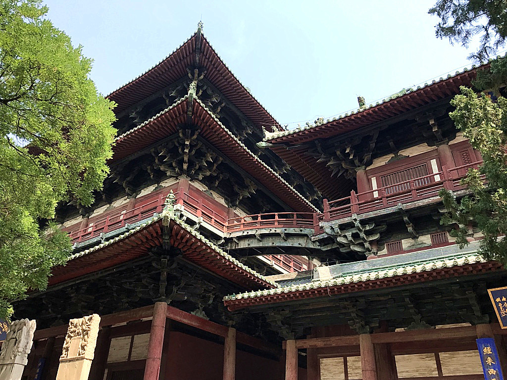 转轮藏阁始建于北宋,梁架结构十分特殊,楼阁下层由于转轮藏的安置,柱网布局突破了常规,采用了移柱造的做法,而檐柱则采用了插柱造法,这在中国古建筑中极为罕见。阁内的木制转轮藏是一个能够转动的大书架,直径7米,整体分为藏座、藏身、藏顶三部分,中间设一根10.8米的木轴上下贯穿。整个转轮藏的重量由底部藏针承受。转轮藏建造于北宋,是我国现存时代最早,体量较大的一个。