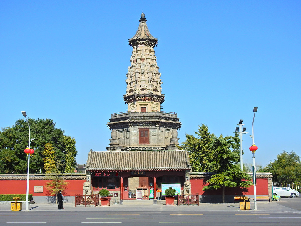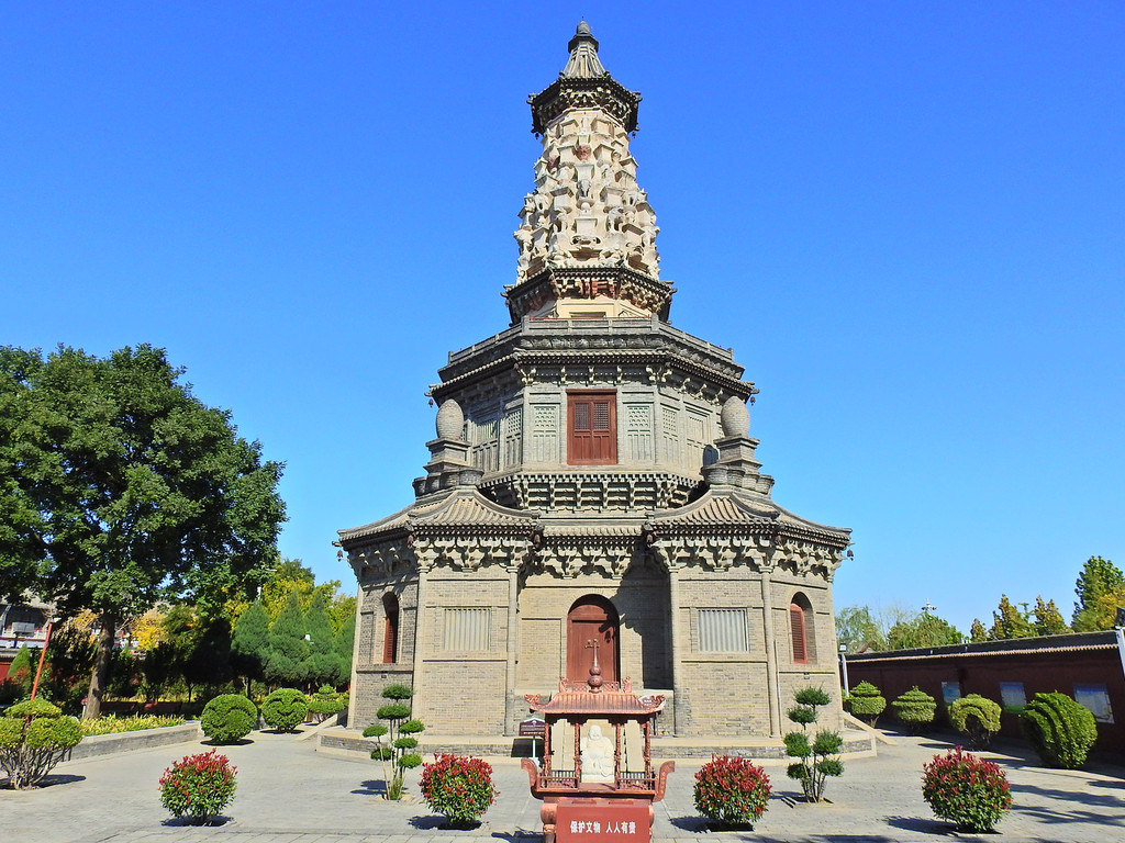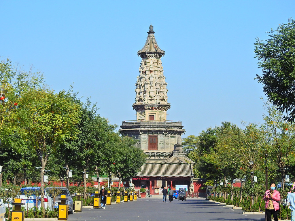 广惠寺华塔,又名多宝塔。华塔由主塔和附属小塔构成,全用砖砌。主塔底层四隅各附建一座扇六角形亭状小塔,小塔环抱主塔,高低错落,主次相依,精巧华丽,壮观秀逸。是非常罕见的宝塔建筑风格。