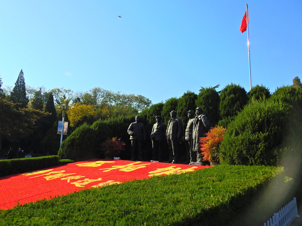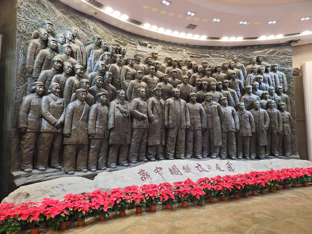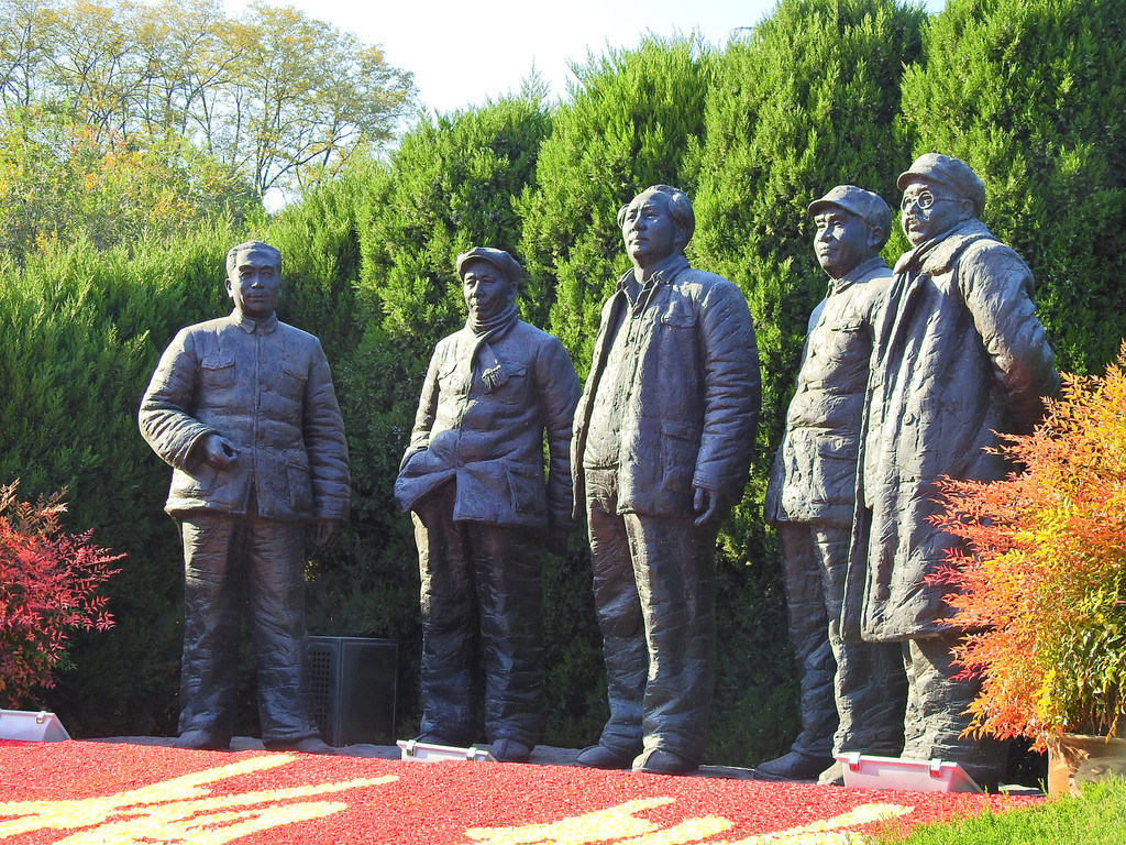 五位书记的铜铸像。青铜铸像,均高2.5米。艺术地再现了西柏坡时期中国共产党第一代领导集体充满胜利的喜悦和对未来无限憧憬的情景。