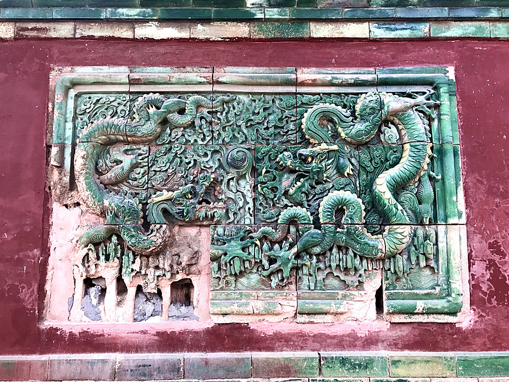 双龙照壁,照壁之中有两条栩栩如生蛟龙。据传在大佛寺门前修起了这座照壁,把二龙牢牢地嵌在中间,这样一来镇锁了蛟龙使它不能作恶,二来也遮掩了大佛寺没有山门的尴尬