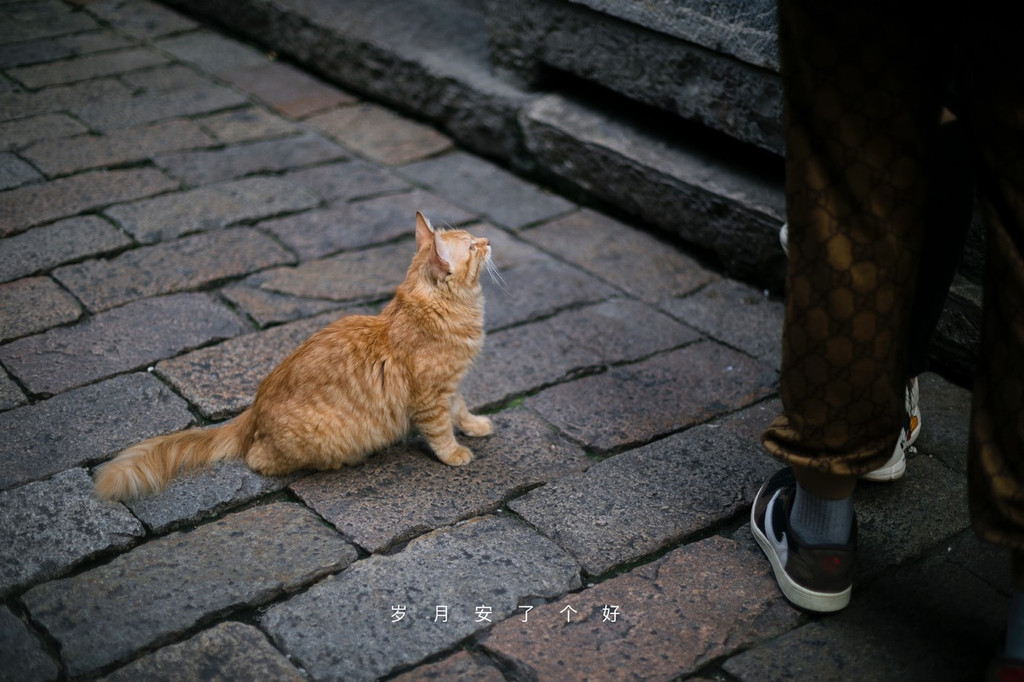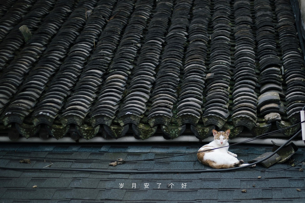 小镇上养小动物的人家很多,桥上,屋顶上会突然的出现一只不怕生人的猫咪,可能远远的它就已经看到你了。