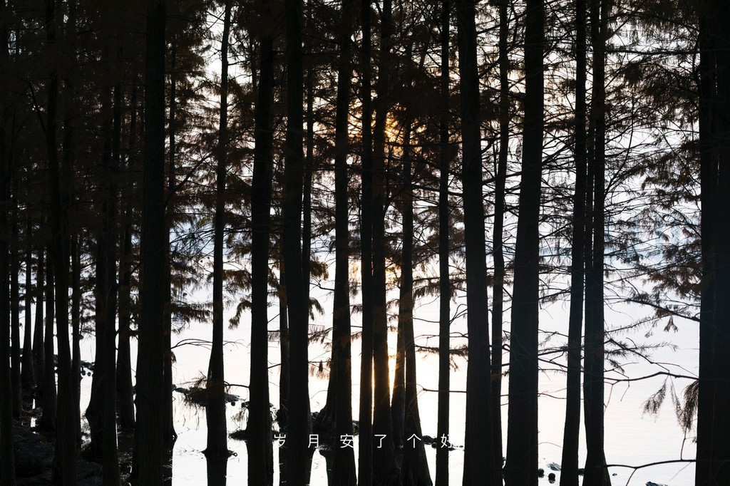 白鹭园位于独墅东侧,公园内的河面,长满了芦苇,这里临河的湿地里种满了一排排的水杉树。远远望去阳光会从树缝隙中透出一些光线,在日落的逆光里,黑压压的只剩下轮廓。