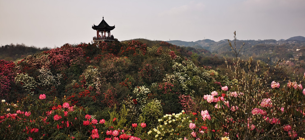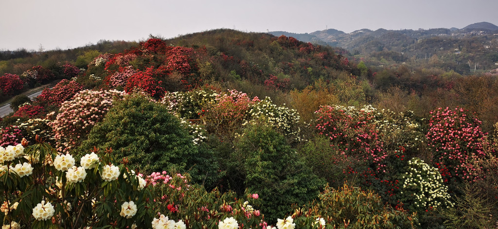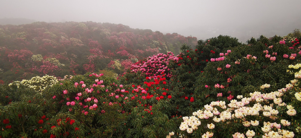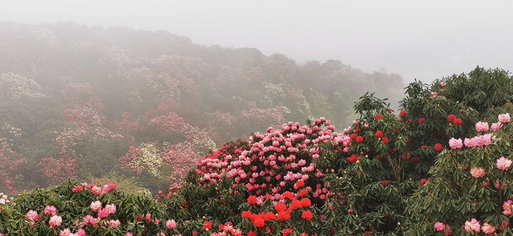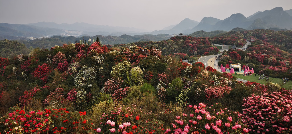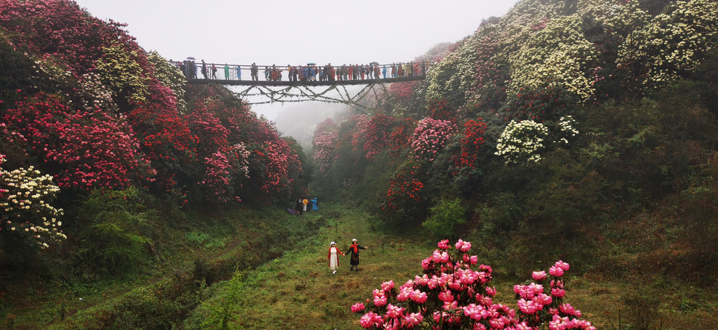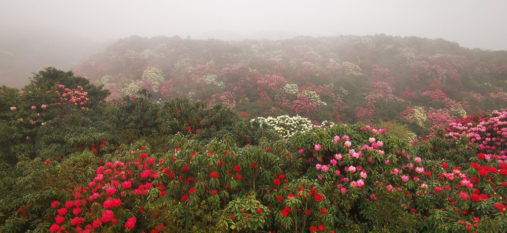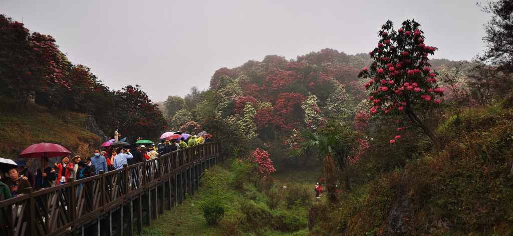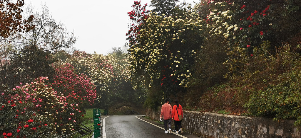 行至开阔处,见花开遍野,远远近近,层层叠叠,到处是各种颜色的杜鹃花,百里杜鹃景区是地球上的天然花园,世界上最大的杜鹃花海,杜鹃所有的五个亚属都有,有41种之多,各种名目实在难以分辨。各色游人,说笑的,拍照的,唱歌的,跳舞的,直播的,飞无人机的,各得其乐。