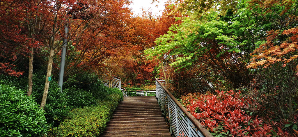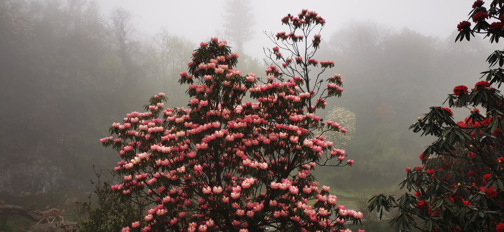 第二天,清晨7点醒来,整理好出门,却发现天在下雨!雨虽然不大,雨雾迷蒙,难言赏景,顺着公路,漫无目的,随意走走,雨却没有要停的意思,索性回房间休息,不觉睡意来袭,再醒来,已是下午1点,待在房间实感憋屈,犹豫之下,乘景区交通车,到达金坡景区,雨似乎更大了,游人却依旧很多,去网红桥是要排很长的队,对此我是拒绝的。听听音乐,等待天色亮一点的时候,拍了几张照片,雨雾之下,娇花有朦胧之美,山色有仙境之感。但景区基本走完,心中遗憾满满!