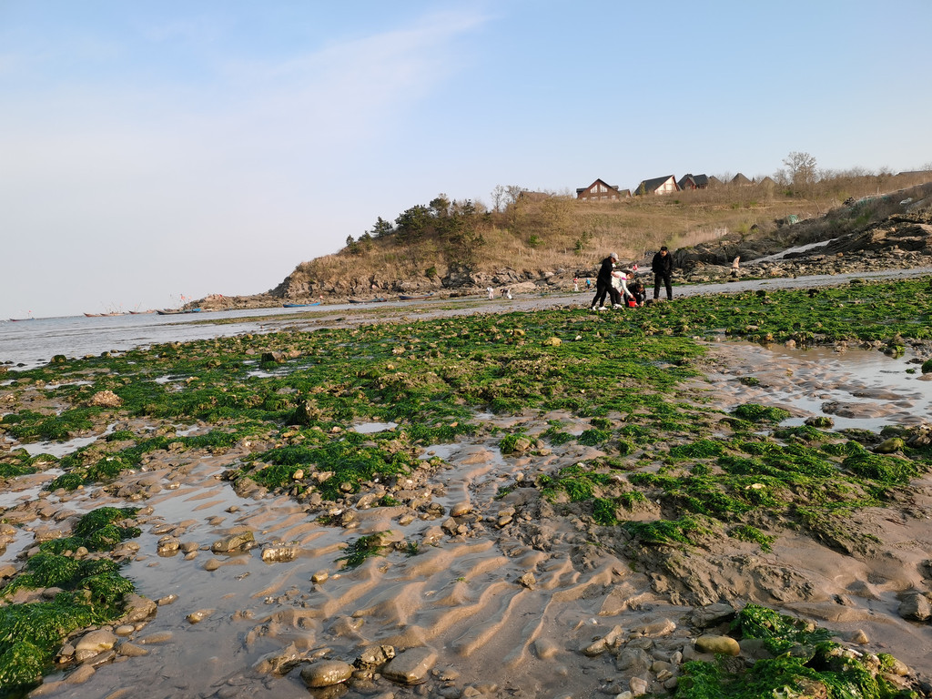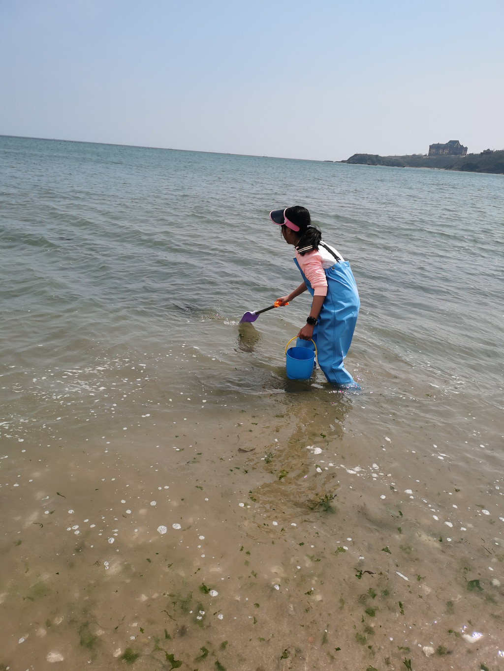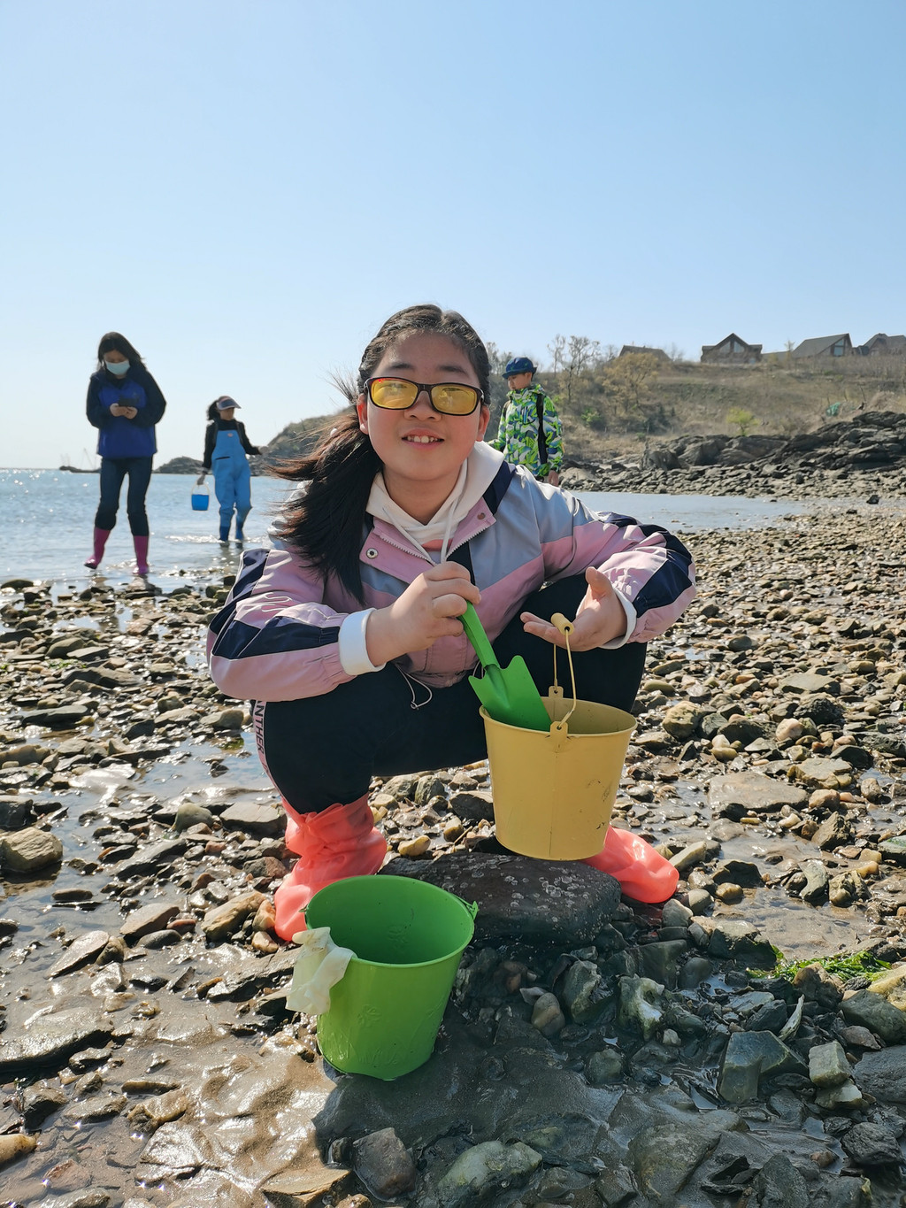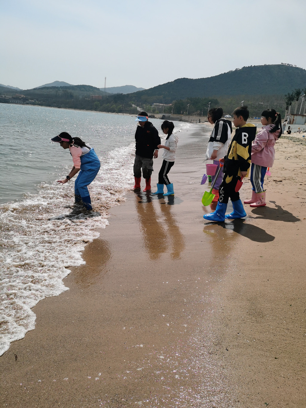 第一天下午我们去了民宿前面的月亮湾赶海。月亮湾浴场海岸线呈弧状,长1500米。月亮湾里的沙滩叫金沙滩,浴场内沙质细、海水清、海滩坡度小,涨潮和退潮均逞奔腾之势,为洗浴、冲浪的极佳场所,自然景观也十分独特。吃过午饭,大人们休息片刻,大家穿好靴子开始了快乐的赶海之旅。随着潮水开始退却,我们漫步在海边,海浪一波盖过一波,我们兴奋的奔向大海,捡了许多的漂亮贝壳,海螺。