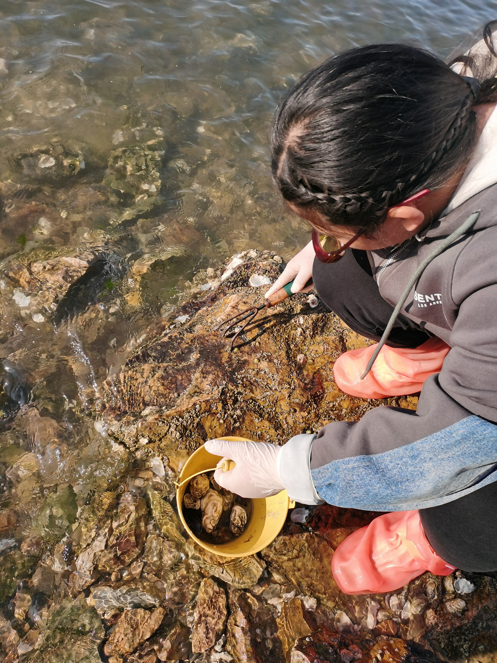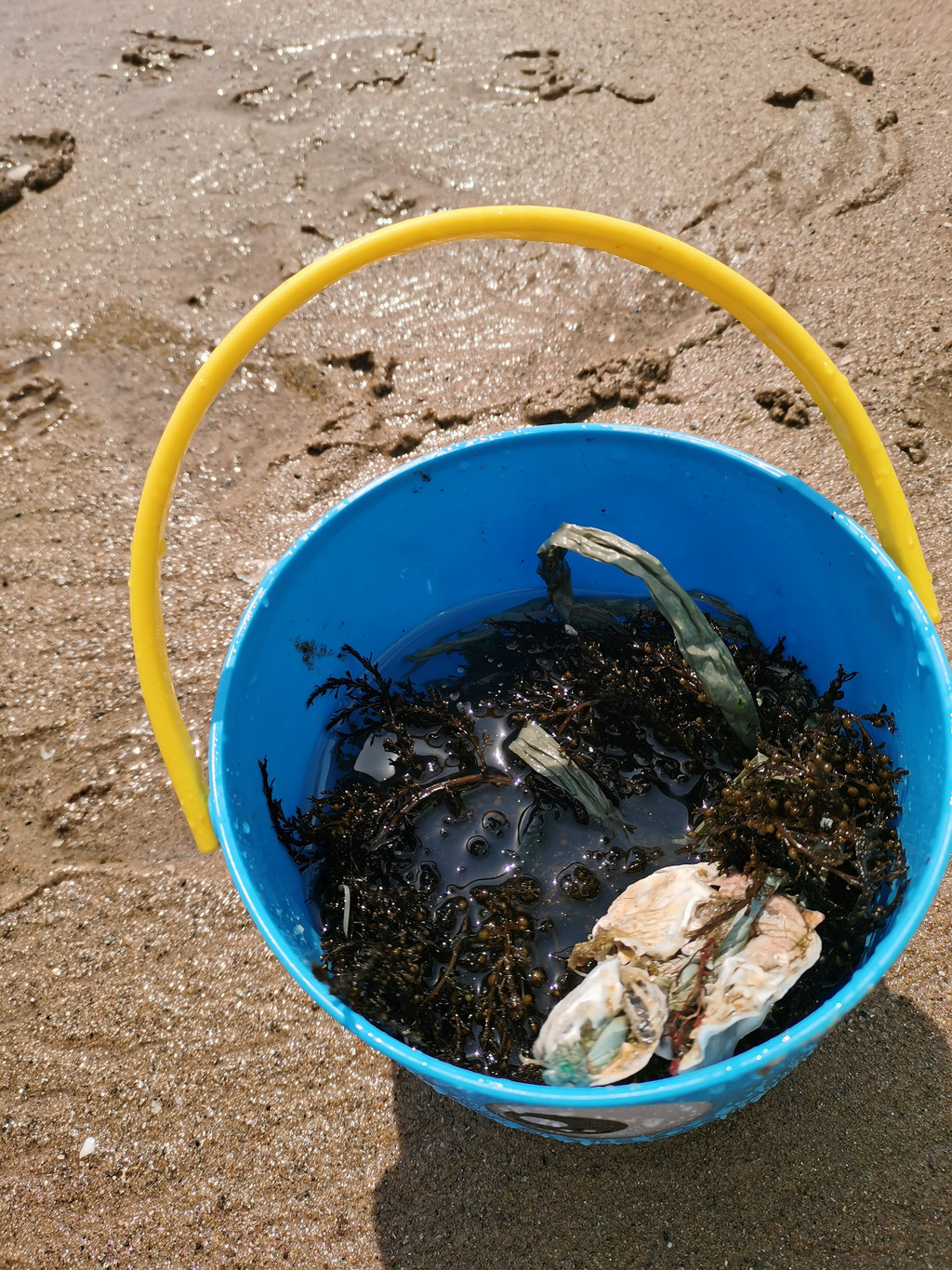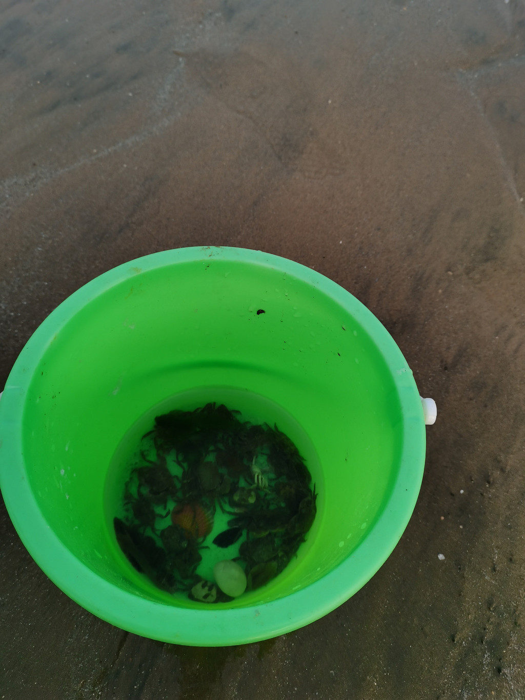 下午打车来到了盐场赶海,换个地方看看是不是有不一样的收获。刚到盐场时,这里很臭,所以建议你们来盐场的时候带上口罩,这可能是因为鸭子的粪便和坏掉的海洋生物造成的。一来到这里,才刚刚开始退潮,我们都还没见到活物,觉得这里特别没意思。可是后来,随着潮水的逐渐褪去,我们都纷纷抓到了很多好东西。往里走,活物越来越多:有生蚝、贝壳、海锥锥、螃蟹,龙虾等,还有类似鲍鱼的小生物,不知道它的名字。