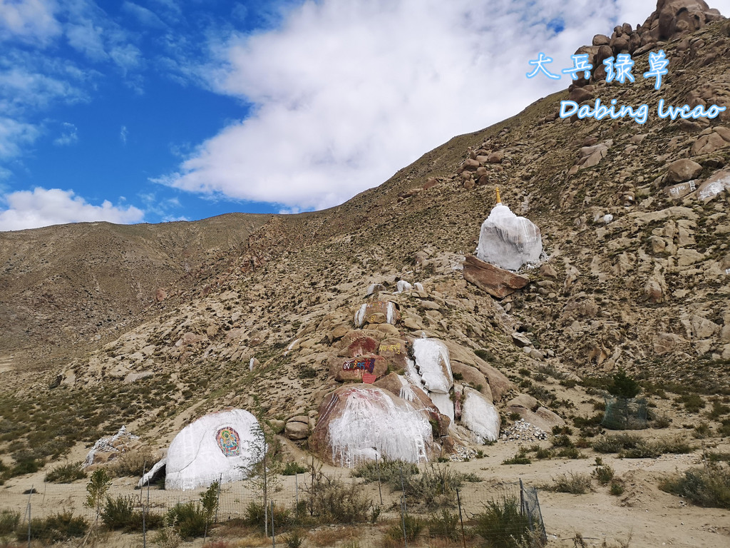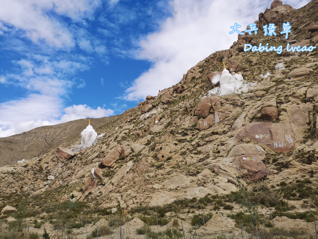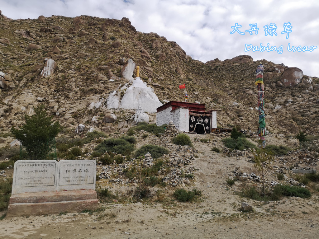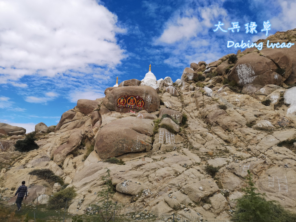参观完桑耶寺,我们沿着道路前往敏珠林寺,途中,道路右侧山上出现了一些白塔,我们停车仔细一看,原来是松卡石塔,它位于桑耶寺以西15公里的雅隆藏布江边一座岩石山脚下,有大小不同五座石塔和一些摩崖造像组成,这些石塔通体白色,由整块巨石雕刻而成,高约2米左右,据说是莲花生大师设计主持雕造的。也有传说是莲花生大师为证明自己的法力,从虚空中变换出来的,这些充满神话色彩的传说,为佛塔增添了神秘色彩。据考证,松卡石塔与桑耶寺属于同时期的石雕建筑,佛塔造型基本相同,只是大小各异,它们对研究吐蕃时期佛塔的造型艺术和建筑风格有很高的价值,而石塔的摩崖造像则呈现出不同时期的风格,表明是后人陆续添加的。