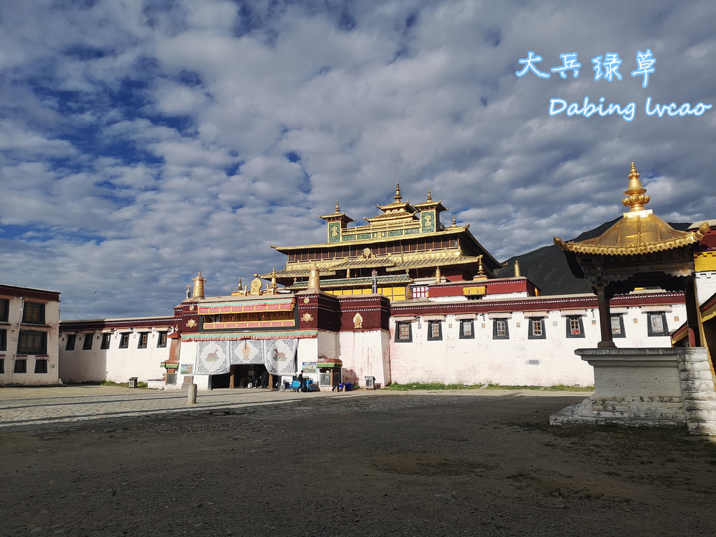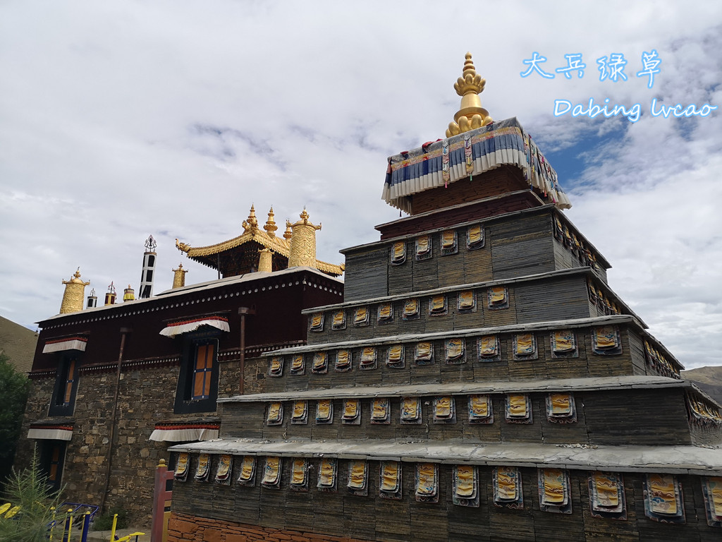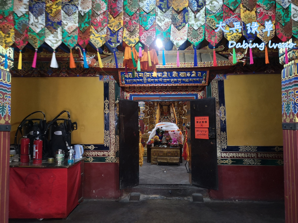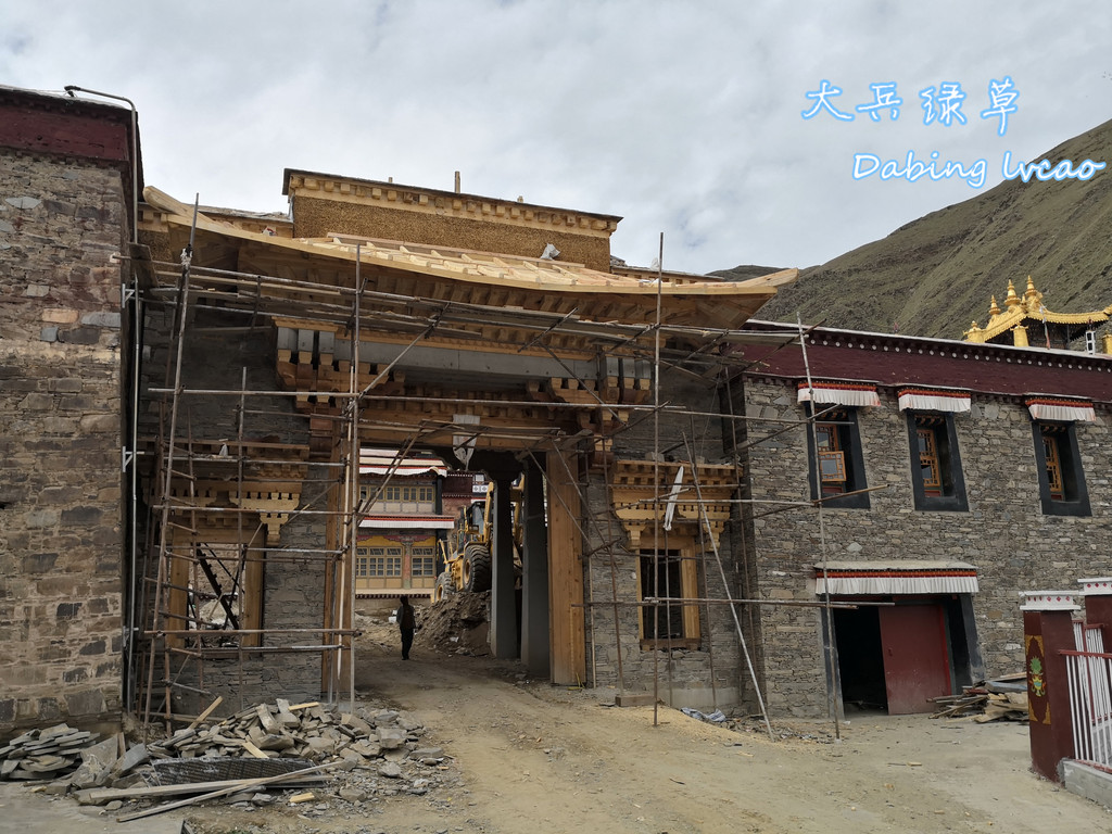 按照有关资料对敏珠林寺的介绍,它应该处于群山环抱之中,可我们按照导航指引来到敏竹林寺,就好像进入一个村庄的大庭院一样,在停车场停好车,来到寺庙大门前,感觉这大门不像正门而像侧门,走过门廊看见祖拉康佛殿,才真实地感到进入了一座寺院,不过敏珠林寺好像正在进行维修之中,寺院北侧的大殿正在维修,东北侧正在修建一座大门,大门外东北不远处和南侧各有一座白塔,一派繁忙而又祥和的气氛。