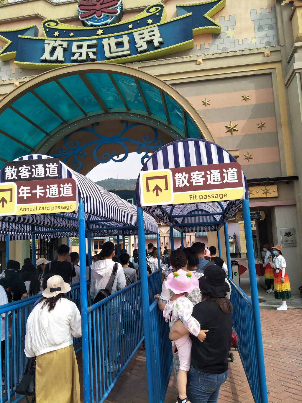 乐园9点开门,可以提前安检进去排队。准备好行程码过安检,刷身份证入园。带大孩子或者朋友玩,1.2M以下和10岁有限制。
