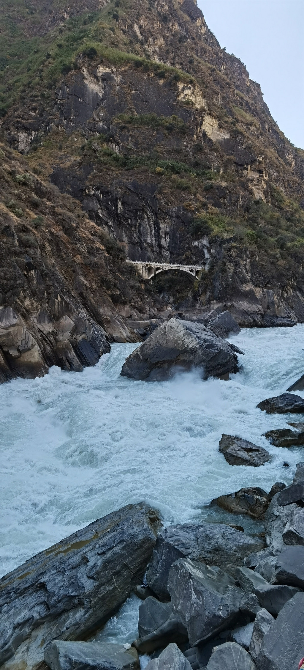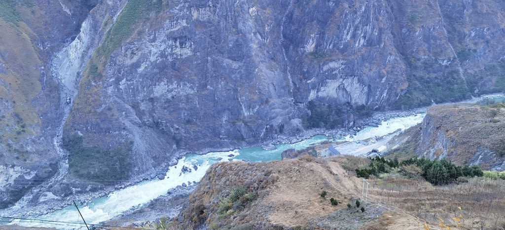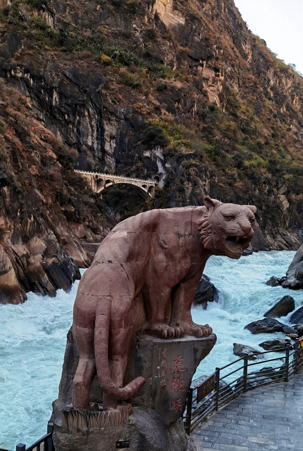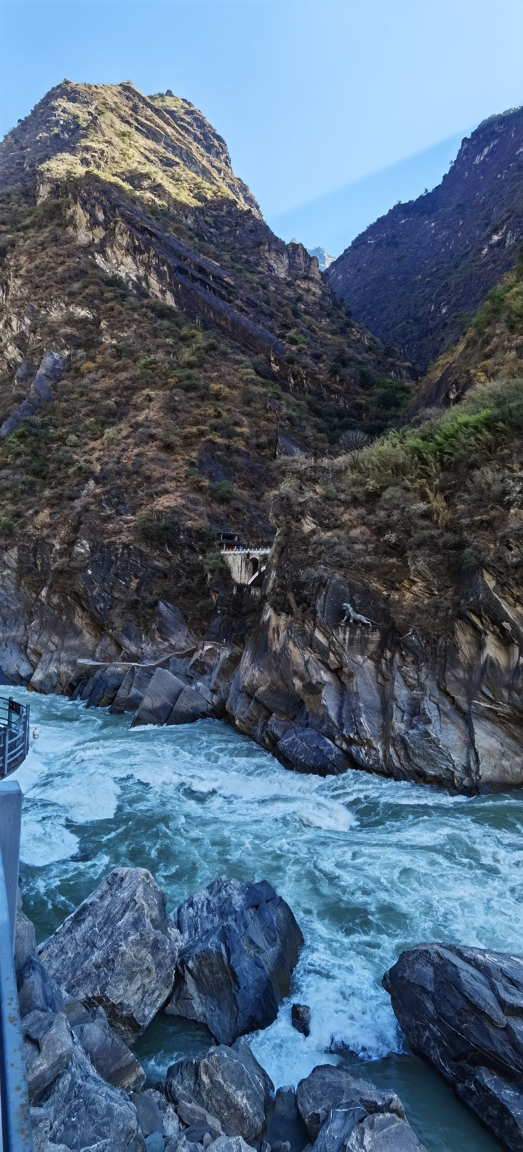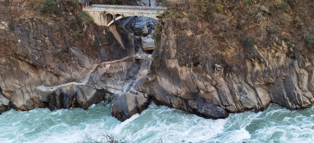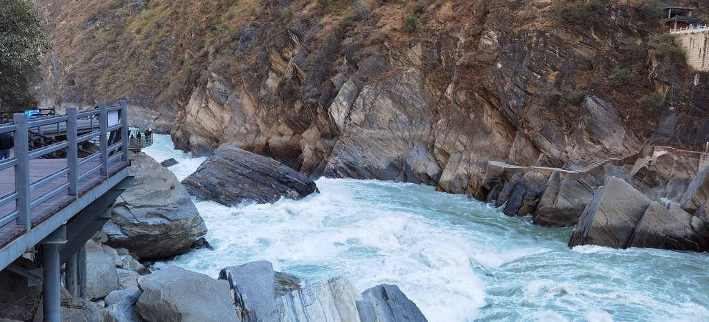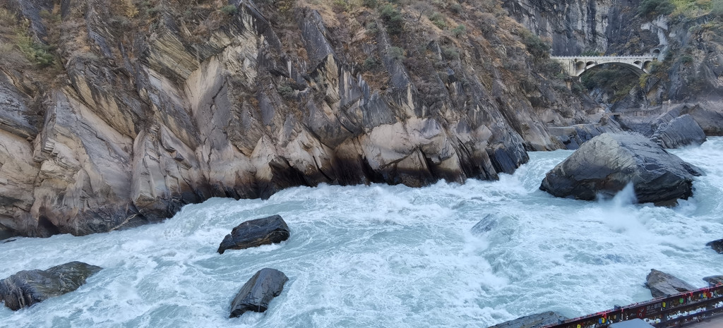 虎跳峡就在两座雪山之间。从峡谷入口到出口直线距离不到20公里,可海拔落差达到了170余米。江面最窄处不到20米,江道上有巨石阻隔,险滩有18处之多。几公里之外,金沙江还是江面开阔,水流平缓。江水在此遇阻后,一入峡口就如同脱缰的野马咆哮奔腾起来,骇浪拍石,惊涛震天。山林中的老虎往返于两山之间要借助江心中的巨石落脚再一跳,跃到对岸,由此得名“虎跳峡”。这一段的金沙江是丽江市和迪庆藏族自治州的分界河。丽江那边玉龙雪山山岩陡峭,没有道路和落脚之地。迪庆香格里拉这边的哈巴雪山山势较缓,修建了观景平台。所以观看虎跳峡一般都在香格里拉这边。在虎跳峡江边可以看到新开通的丽香高速上的金沙江大桥,上下车道两桥并列那是相当的壮观。但是由于这一带地型太复杂,高速公路都是在山腰的隧道和高架桥连接通过,根本无法给虎跳峡留出入口,所以无论是从南、北哪个方向来都要早早地下高速。我来之前还不理解,这么重要的景区,高速为什么不给留出口?走过一次就明白了。