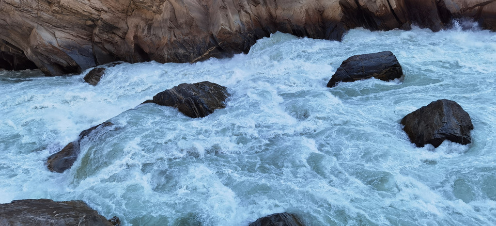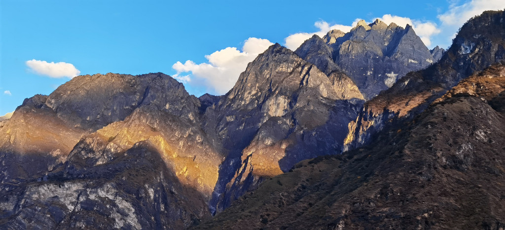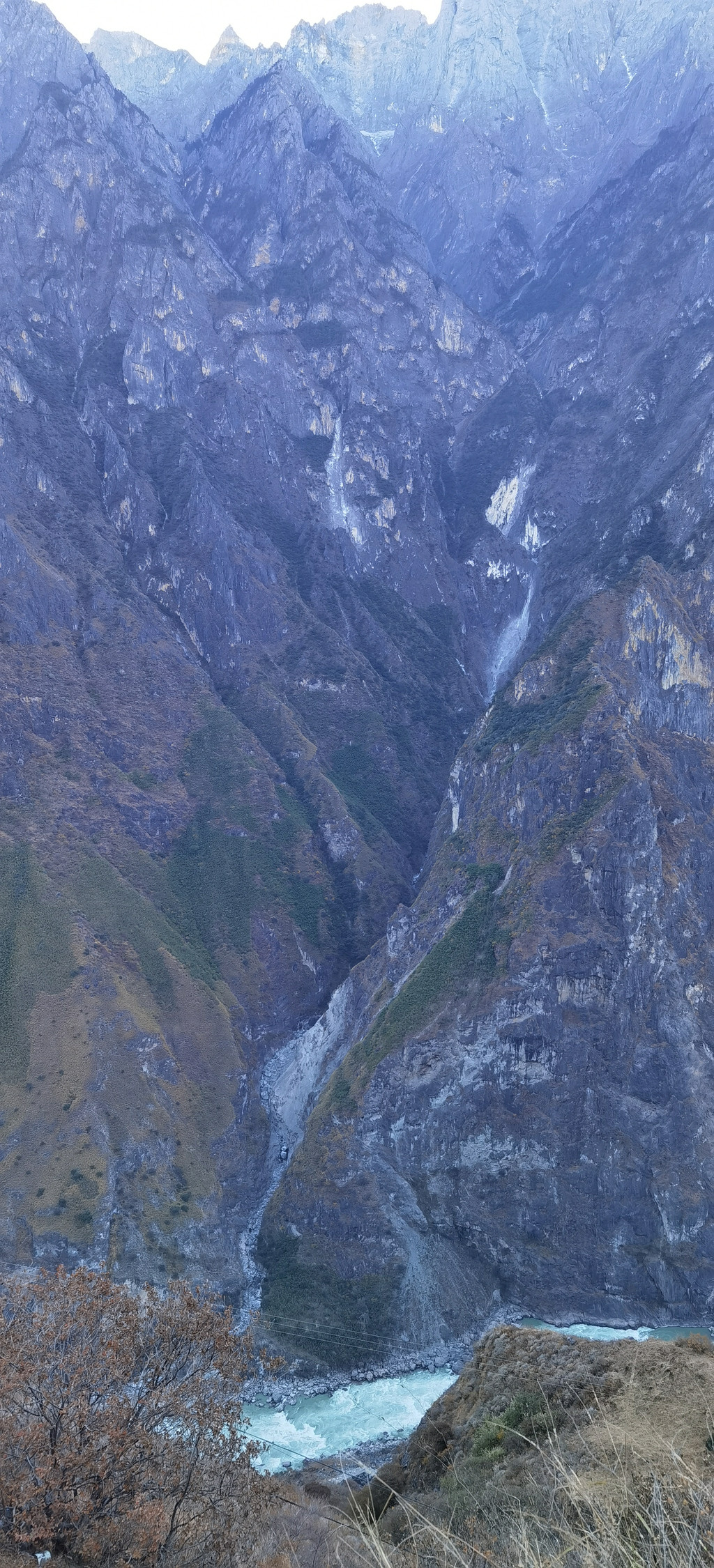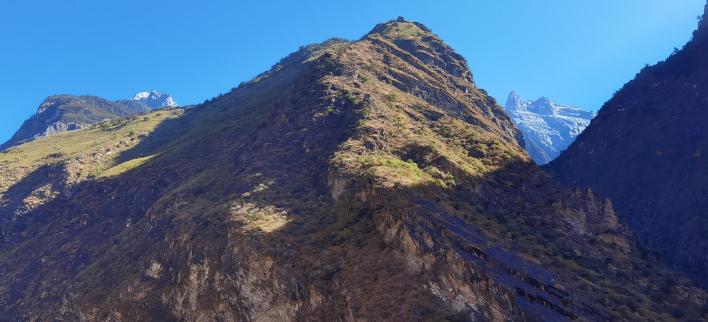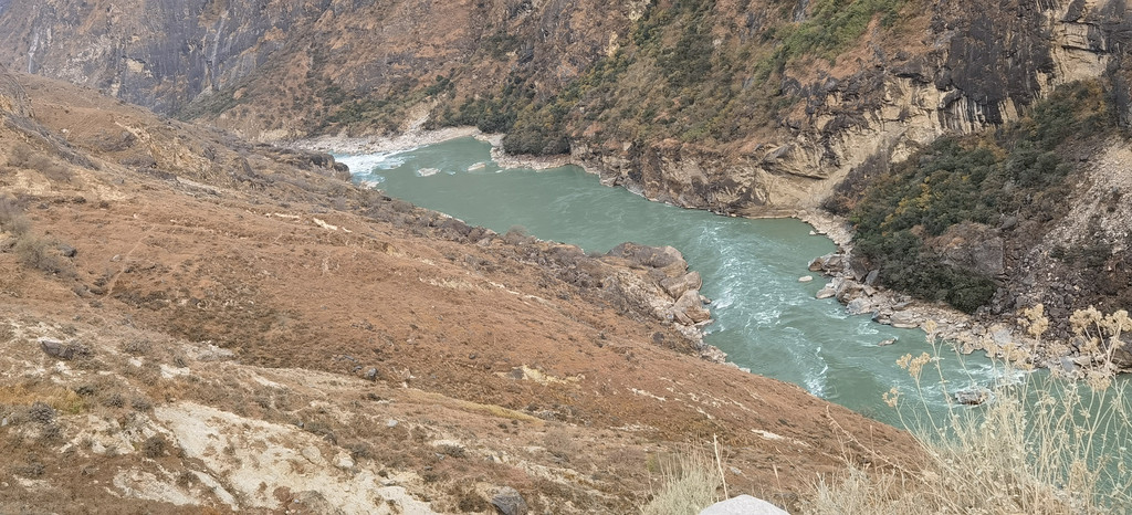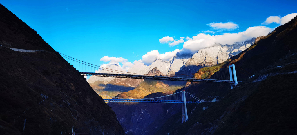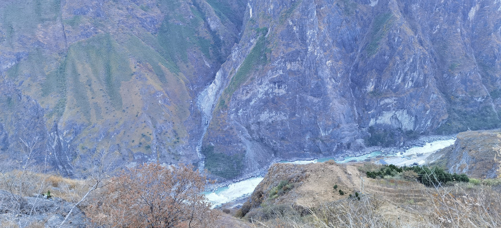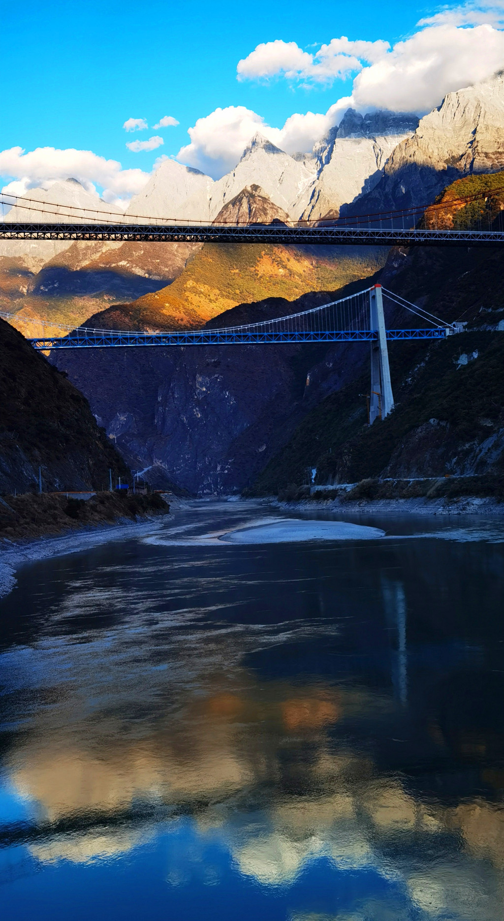 虎跳峡就在两座雪山之间。从峡谷入口到出口直线距离不到20公里,可海拔落差达到了170余米。江面最窄处不到20米,江道上有巨石阻隔,险滩有18处之多。几公里之外,金沙江还是江面开阔,水流平缓。江水在此遇阻后,一入峡口就如同脱缰的野马咆哮奔腾起来,骇浪拍石,惊涛震天。山林中的老虎往返于两山之间要借助江心中的巨石落脚再一跳,跃到对岸,由此得名“虎跳峡”。这一段的金沙江是丽江市和迪庆藏族自治州的分界河。丽江那边玉龙雪山山岩陡峭,没有道路和落脚之地。迪庆香格里拉这边的哈巴雪山山势较缓,修建了观景平台。所以观看虎跳峡一般都在香格里拉这边。在虎跳峡江边可以看到新开通的丽香高速上的金沙江大桥,上下车道两桥并列那是相当的壮观。但是由于这一带地型太复杂,高速公路都是在山腰的隧道和高架桥连接通过,根本无法给虎跳峡留出入口,所以无论是从南、北哪个方向来都要早早地下高速。我来之前还不理解,这么重要的景区,高速为什么不给留出口?走过一次就明白了。