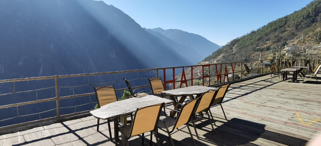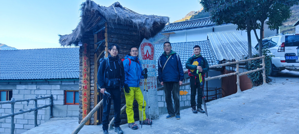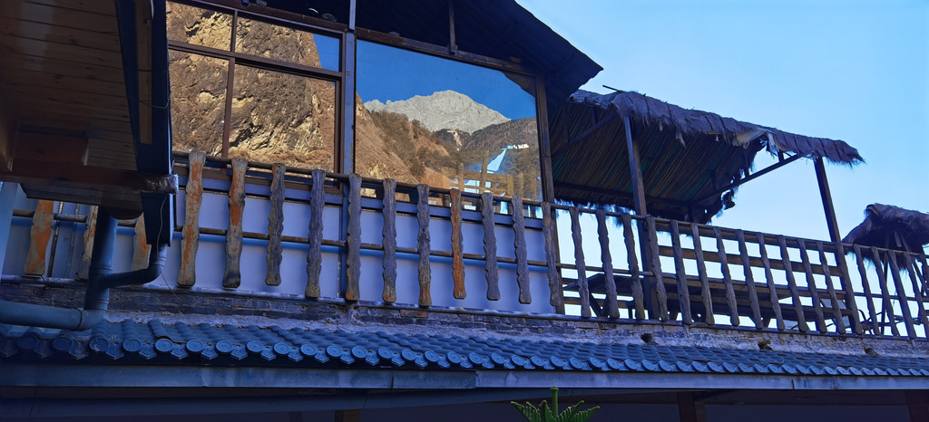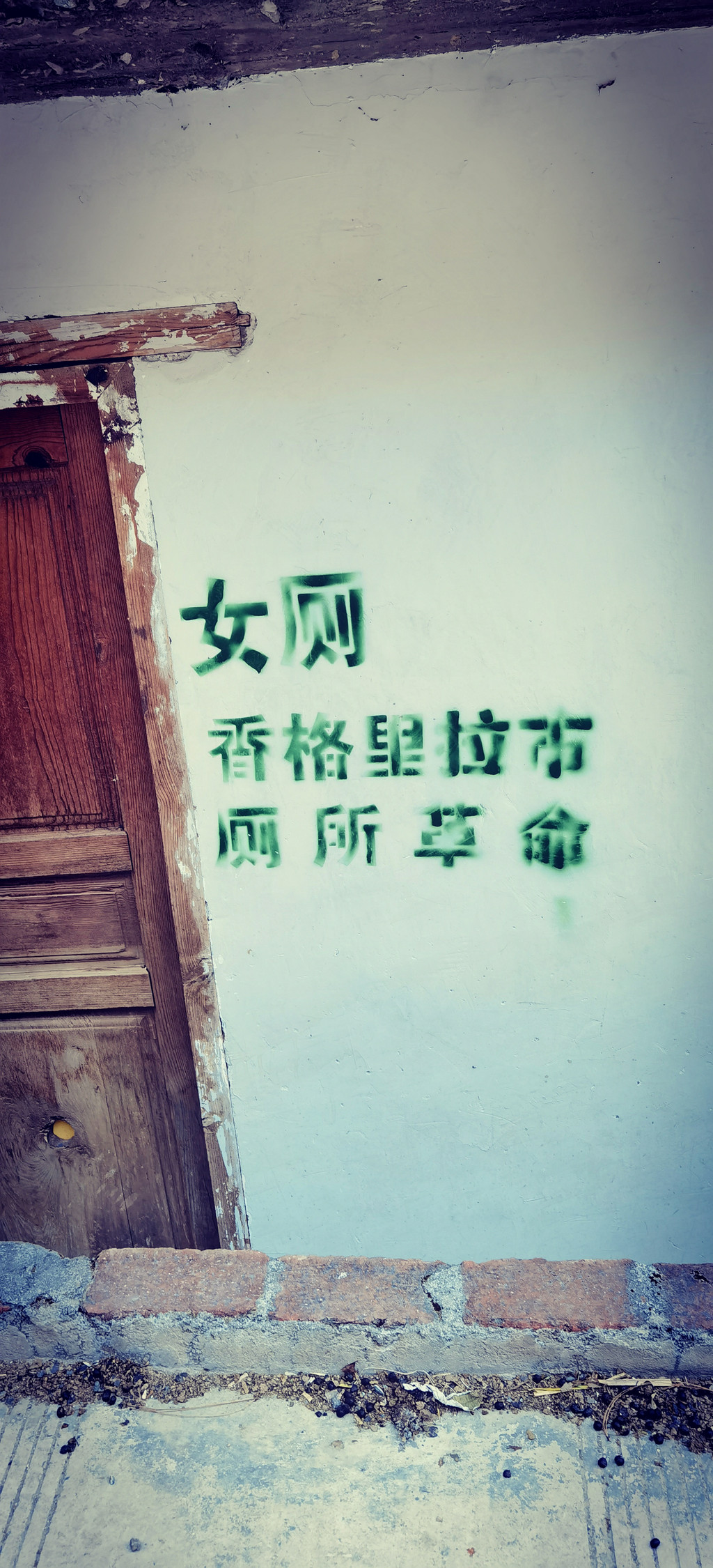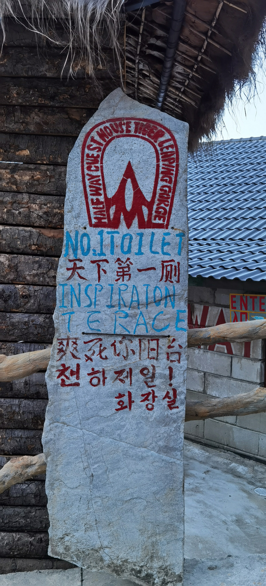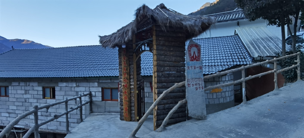 小路上有一些零散的农户和小山村,途中有一家在徒步旅行者中非常有名的客栈,洋名叫“Half Way”意思是半途客栈。意味着从沟口走到这儿大概是一半的路程了。中文名字你绝想不到,叫天下第一厕客栈。客栈在半山腰的悬崖上修了一间厕所,半截矮墙,蹲在那还可以欣赏外面的江山风光。我们是得益于村村通工程,开车从后山绕过来的,当晚我们就下榻在了这家客栈。我们入住时天色已晚,一进门老板娘就问我们晚饭吃中餐还是西餐。一下把我们都惊到了,这么一个大山里的客栈居然可以提供咖啡和西餐,可见来这里的老外还真的不少。站在天下第一厕客栈楼顶平台上正对着玉龙雪山的主峰,海拔5596米。山的另一边就是丽江的玉龙雪山风景区。我们到达这里已是12月中旬,可山顶上的雪很少,只覆盖了一个山尖。听当地人讲,二十年前冬天雪一直能覆盖到半山腰,十年前还能覆盖整个山顶。也不知道是温室效应,还是当地气候变干燥了,雪是越来越少了。走在小路上看到一间公厕,门上喷着“香格里拉市厕所革命”的标语。看来过去这里家家都是能在如厕时欣赏名山大川的。顺便教大家两个彝族文字,“男”“女”,别走错了呦。