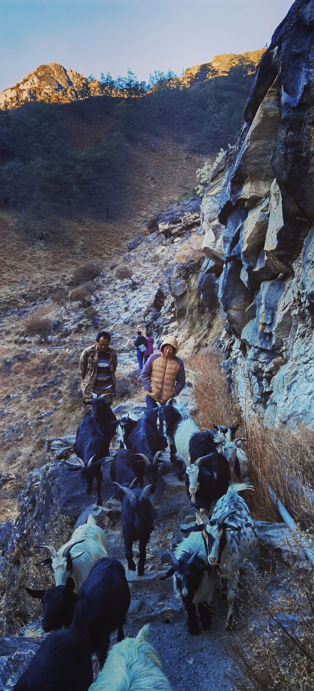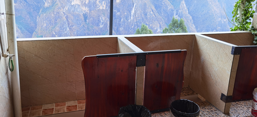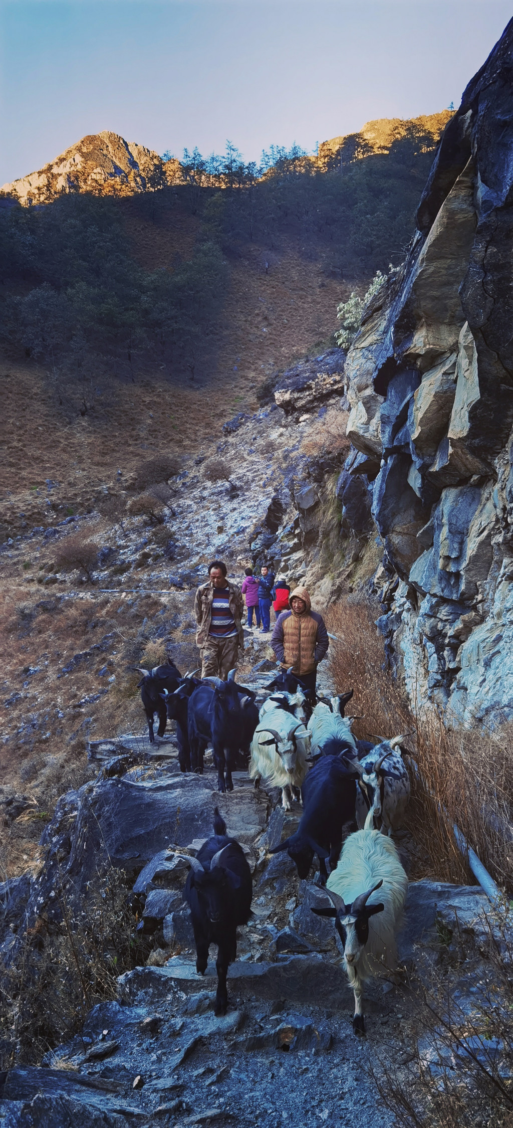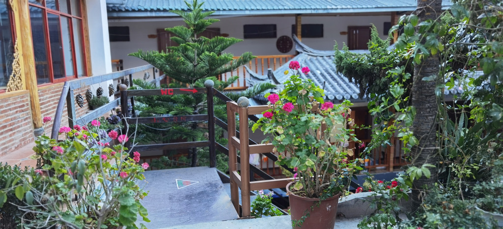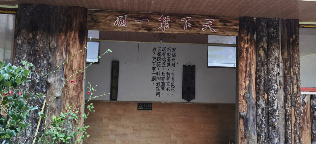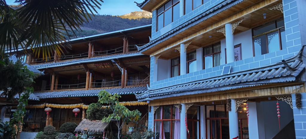 小路上有一些零散的农户和小山村,途中有一家在徒步旅行者中非常有名的客栈,洋名叫“Half Way”意思是半途客栈。意味着从沟口走到这儿大概是一半的路程了。中文名字你绝想不到,叫天下第一厕客栈。客栈在半山腰的悬崖上修了一间厕所,半截矮墙,蹲在那还可以欣赏外面的江山风光。我们是得益于村村通工程,开车从后山绕过来的,当晚我们就下榻在了这家客栈。我们入住时天色已晚,一进门老板娘就问我们晚饭吃中餐还是西餐。一下把我们都惊到了,这么一个大山里的客栈居然可以提供咖啡和西餐,可见来这里的老外还真的不少。站在天下第一厕客栈楼顶平台上正对着玉龙雪山的主峰,海拔5596米。山的另一边就是丽江的玉龙雪山风景区。我们到达这里已是12月中旬,可山顶上的雪很少,只覆盖了一个山尖。听当地人讲,二十年前冬天雪一直能覆盖到半山腰,十年前还能覆盖整个山顶。也不知道是温室效应,还是当地气候变干燥了,雪是越来越少了。走在小路上看到一间公厕,门上喷着“香格里拉市厕所革命”的标语。看来过去这里家家都是能在如厕时欣赏名山大川的。顺便教大家两个彝族文字,“男”“女”,别走错了呦。