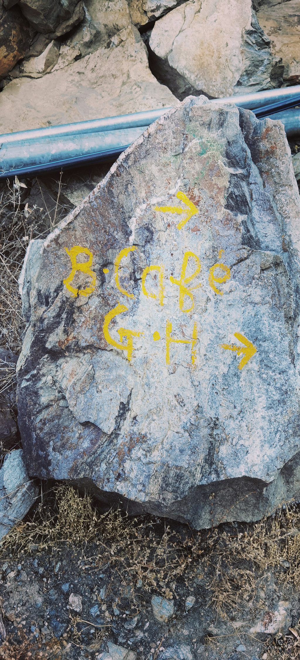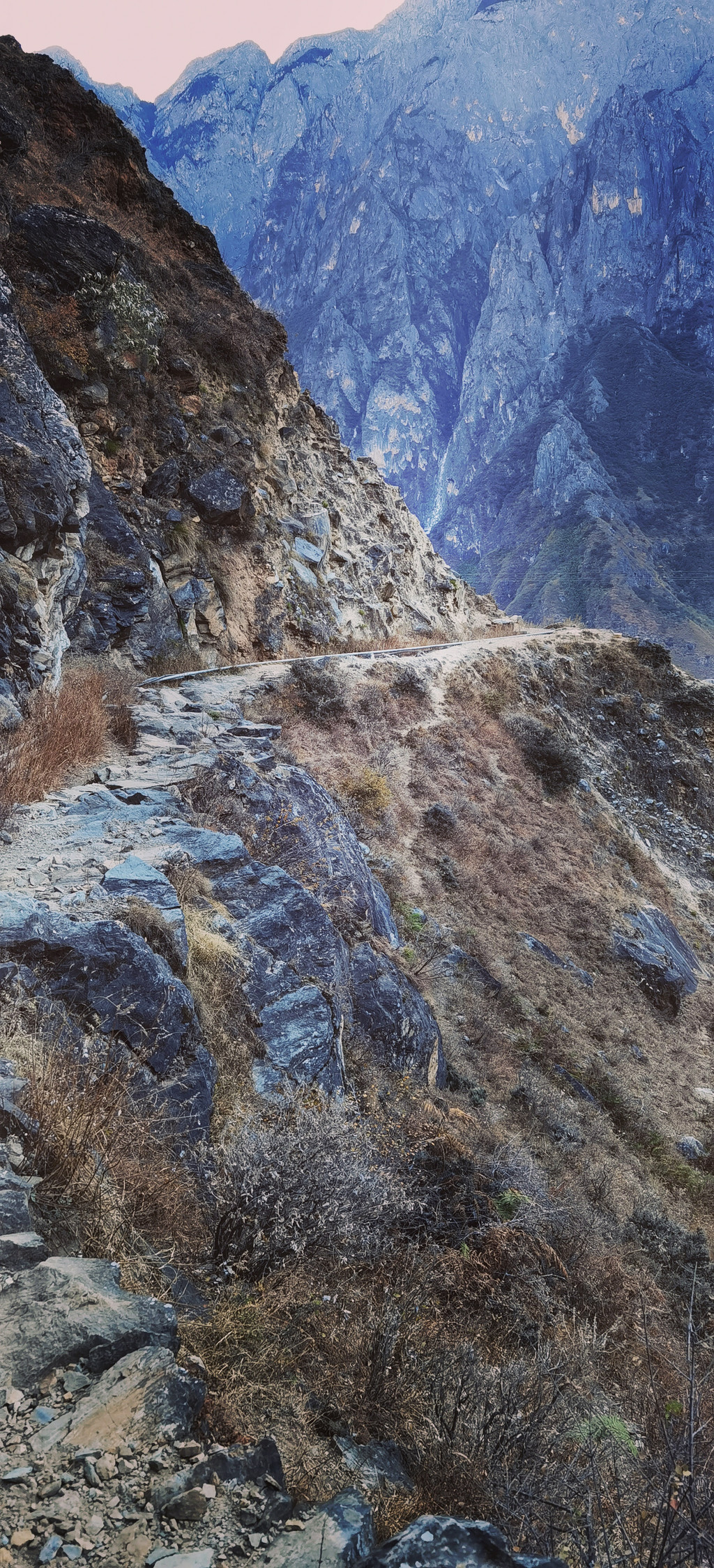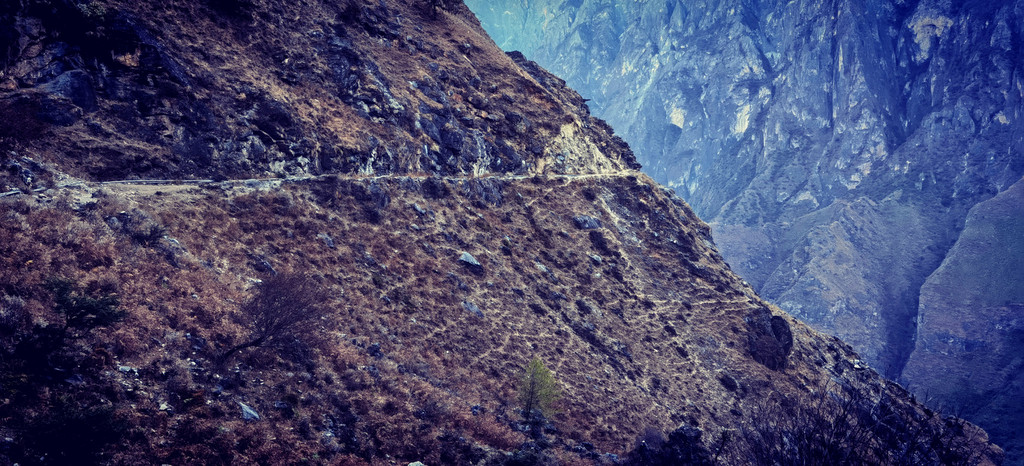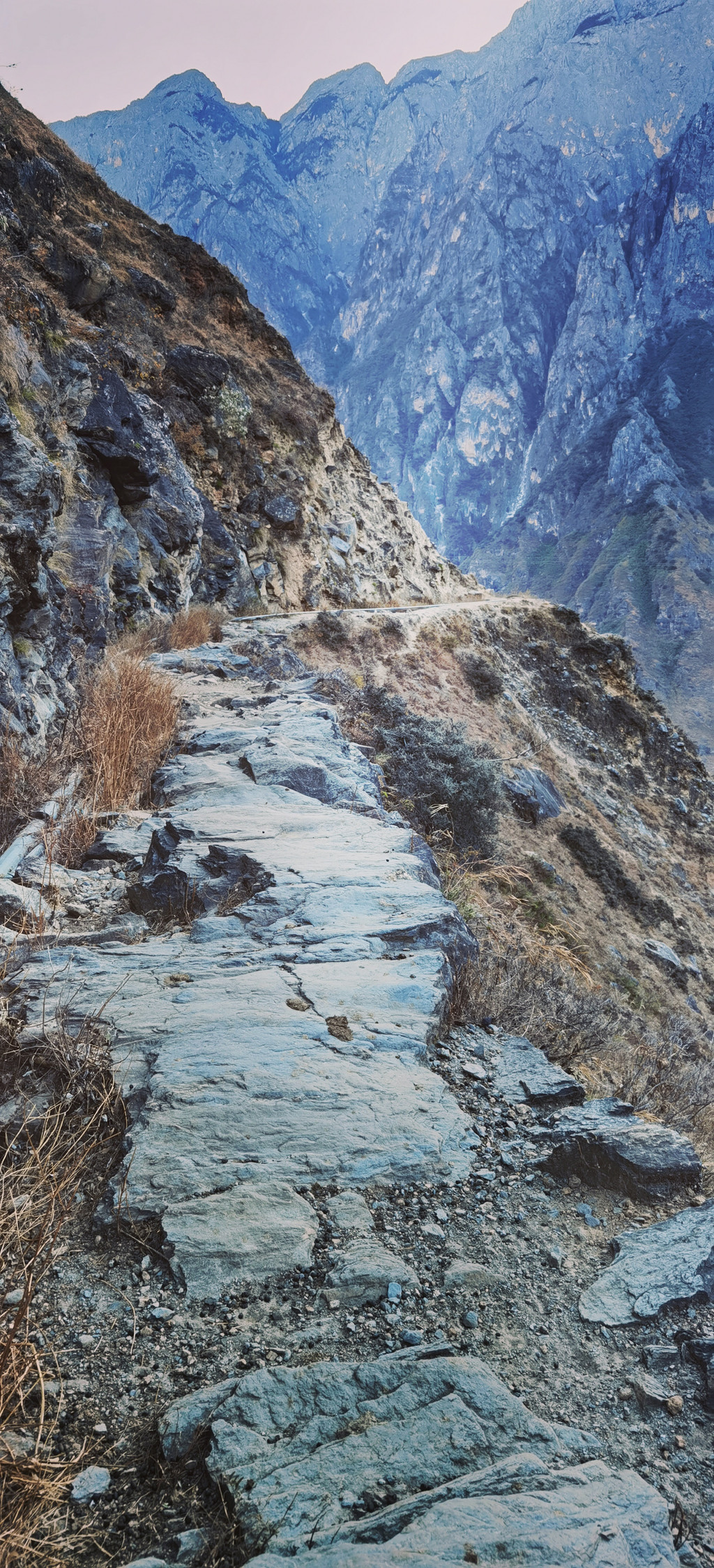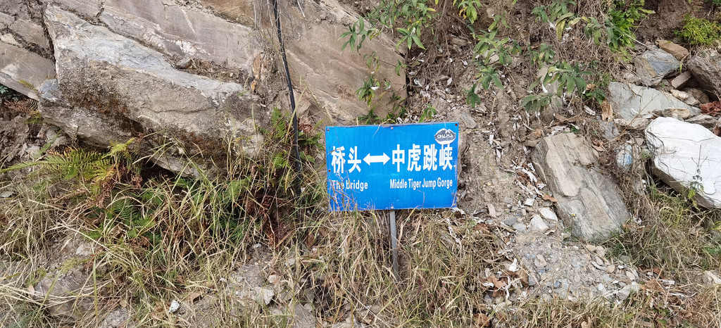 正是由于哈巴雪山东缘山势相对没有那么陡,山坡上有一条当年马帮走的羊肠小路。这条路在全世界徒步爱好者中大大有名,被评选为世界十大经典徒步路线之一。据说还收录进了法国中学地理教科书。徒步者从虎跳峡沟口走到下虎跳峡一般要用两天时间。第二天一早,我们在这条著名的徒步小路上体验了两公里,真是不好走,高低不平,一侧紧贴山岩,下面是滚滚江水。路边岩石上还不时出现外文路标,有英文的有法文的,还有不知道是什么文字。路上还遇到三个徒步的小伙子,他们来自不同的地方,一个江西、一个北京、一个成都,是在徒步中碰到的就结伴而行了。望着他们又出发的背影,我心中特别感慨,年轻就是本钱。
