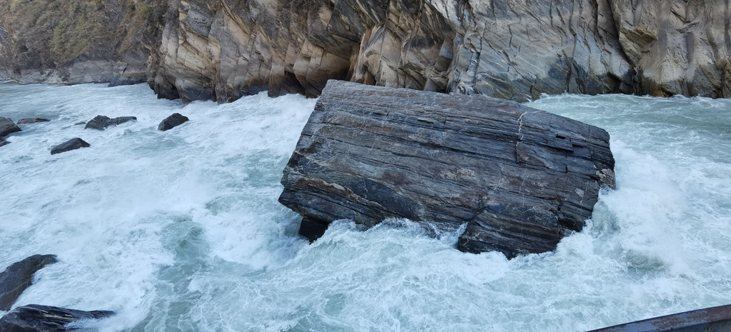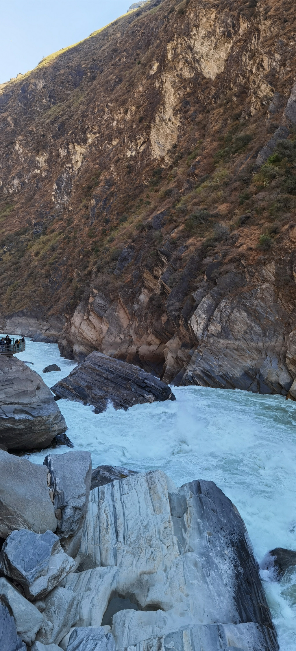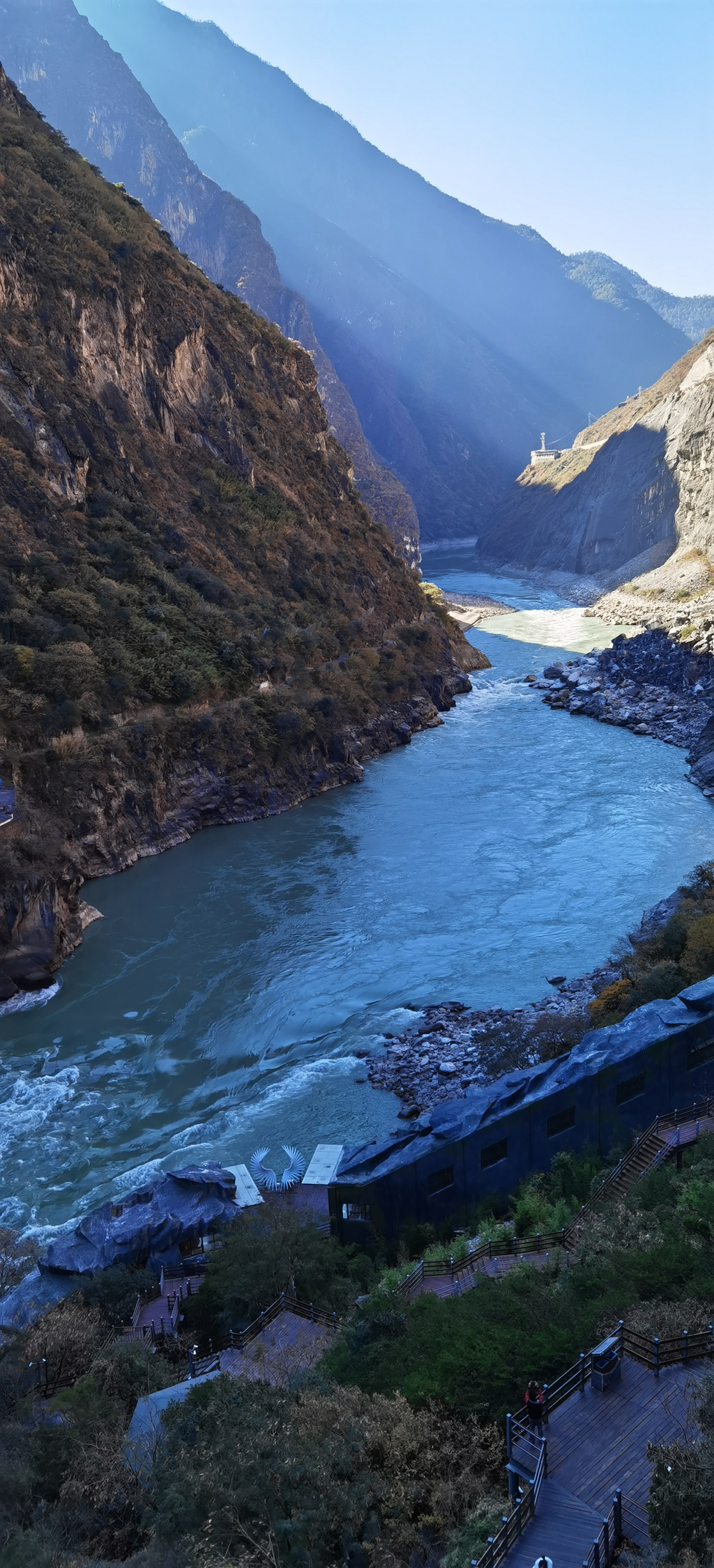 虎跳峡以惊险著称,从峡谷入口到出口分为了上虎跳、中虎跳和下虎跳三段。两岸雪峰海拔都有5000米以上,山顶至江面的陡壁落差也有3000米左右。站在山腰之上还不能完全领略到惊涛骇浪之势,所以观看虎跳峡要下到江边。上虎跳是国家开发比较完备的观赏区,修有参观栈道和观景台。近几年还安装了上下扶梯,确实方便了我们这样的老年人。不然的话,上下都要走2000多级台阶。一般旅游团游览虎跳峡也就止步于上虎跳。我们到来之时是冬季,金沙江属于枯水季节。就这样已经让我们震撼不已。听工作人员说,到来夏、秋丰水季节,江水撞击到巨石上飞溅起的水花如同下雨,游人走在栈道上都要穿雨衣、打雨伞,否则全身湿透。游览虎跳峡门票90元(老人半价),电梯往返70元。