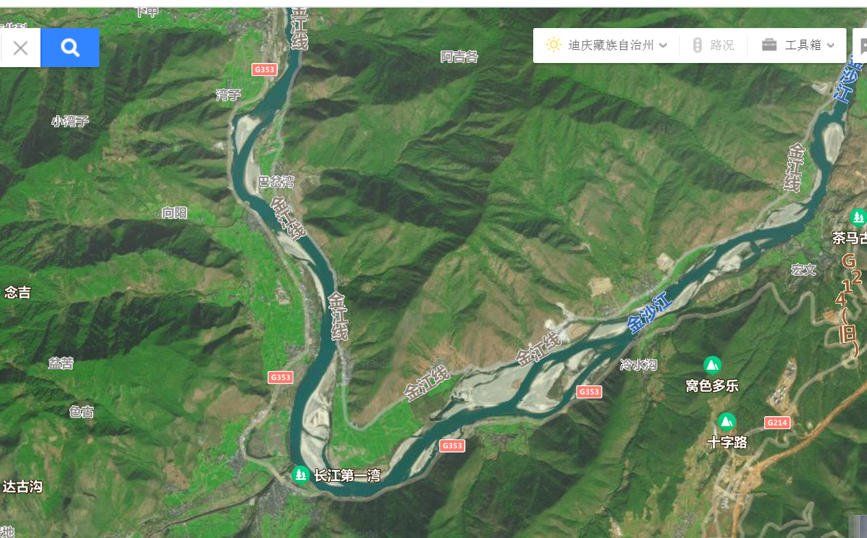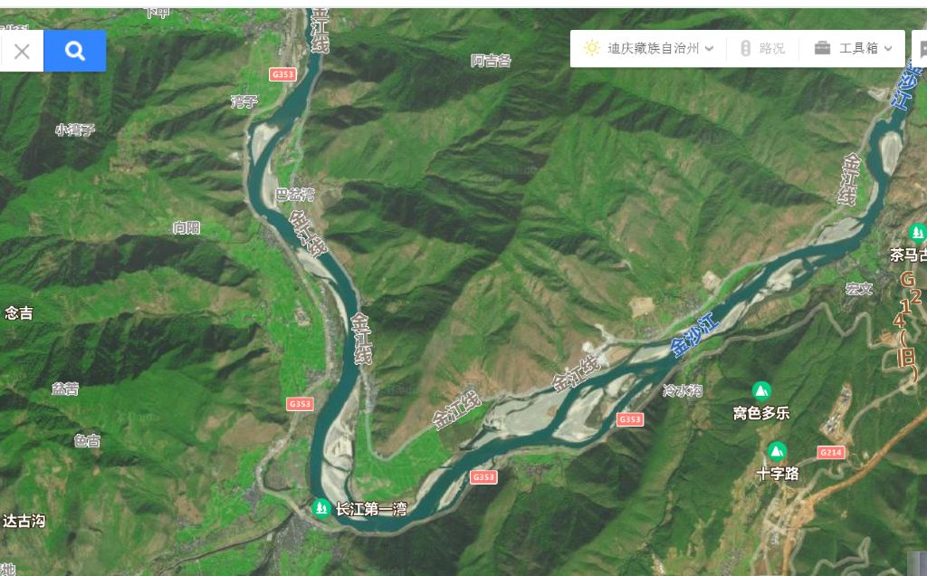 金沙江发源于青海的唐古拉山主峰各拉丹冬雪山,开始一直是向南流,就在丽江北面大约60公里的玉龙县石鼓镇突然拐了个120度角,转向东北流去。到达四川宜宾市,岷江汇入后改称为长江。金沙江拐了这个弯之后生生地在东面的玉龙雪山和西面的哈巴雪山夹缝中处冲开了一条“生路”奔腾而去。