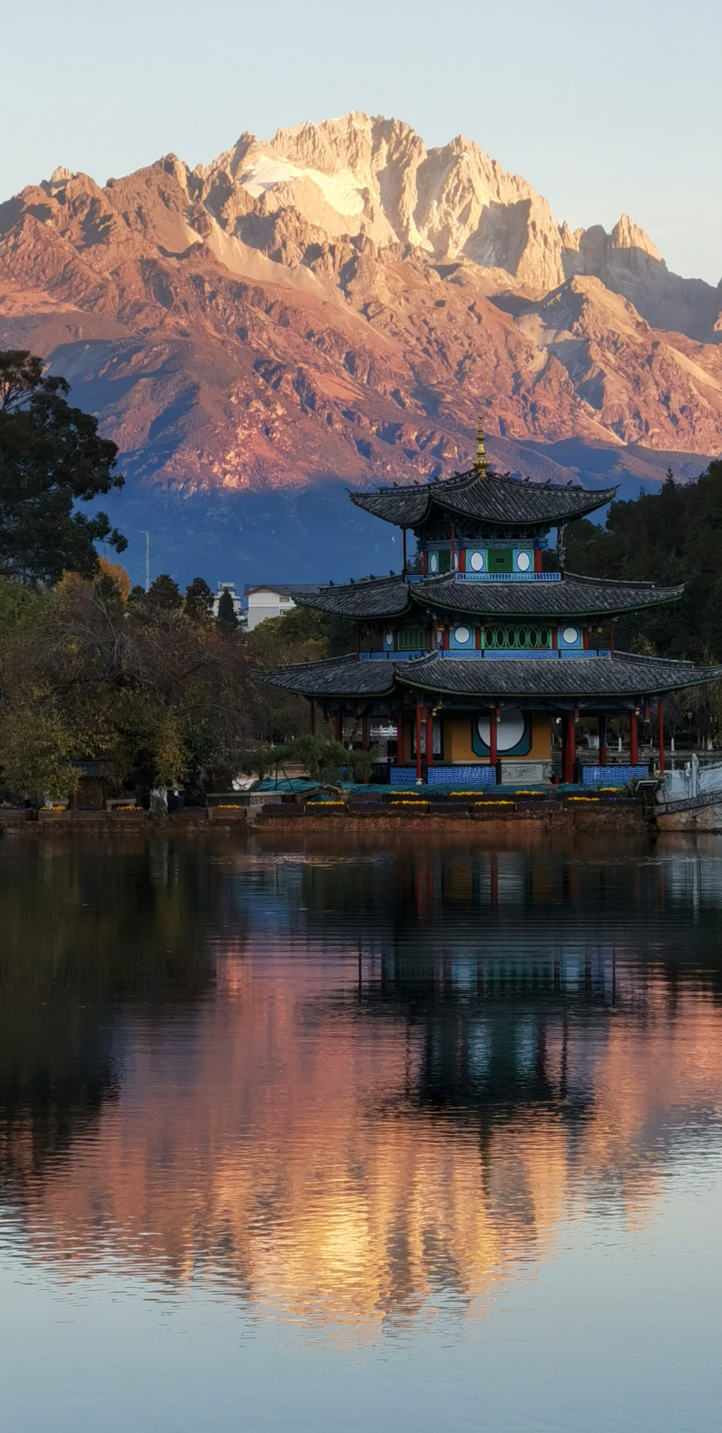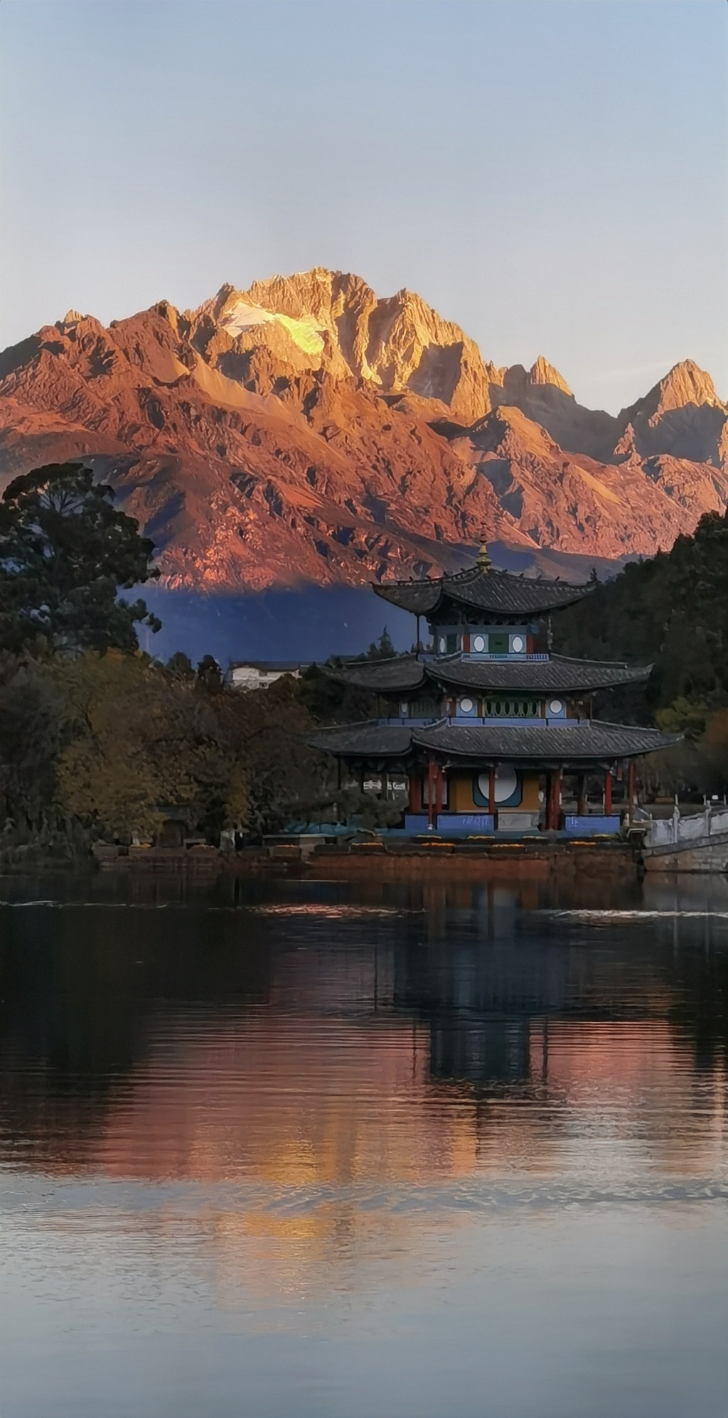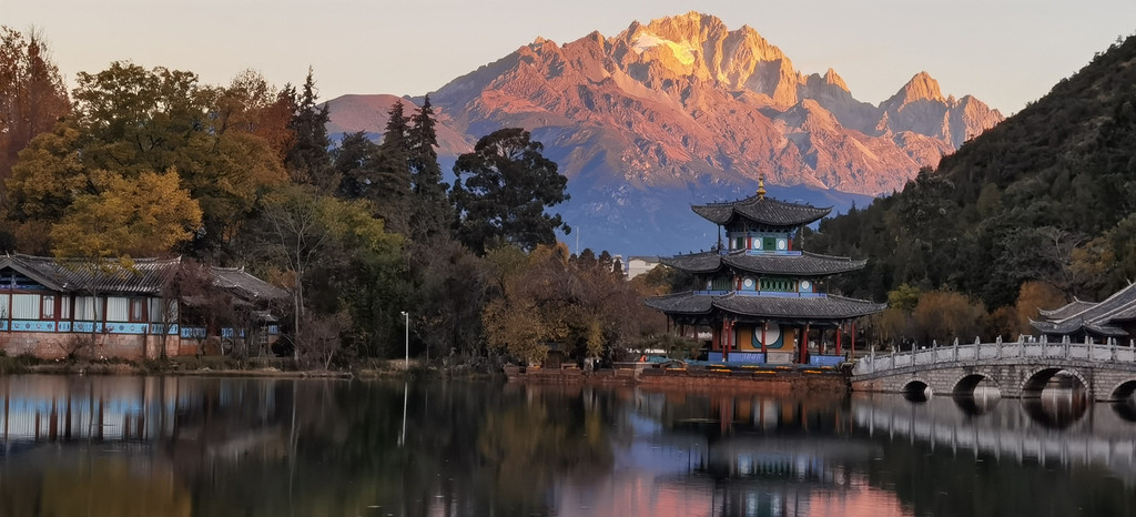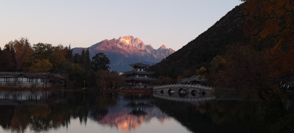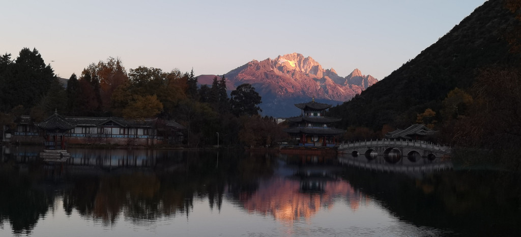 说到丽江古城,真没什么好写的,太商业化了。古城就好像把一个奥特莱斯商场平铺在那了,不是酒吧一条街就是餐饮一条街,再就是旅游商品一条街。在丽江唯一给我留下印象的只有一处,黑龙潭公园。清晨日出时分在公园里的锁翠桥附近是拍摄玉龙雪山倒影的最佳位置。前景有湖中的五孔桥和纳西族风格的得月楼做衬托,再加上玉龙雪山的倒影,还是相当漂亮的。还告诉你个小秘密,这个公园上午10点之前不要门票,不是携程的客户我不告诉他。