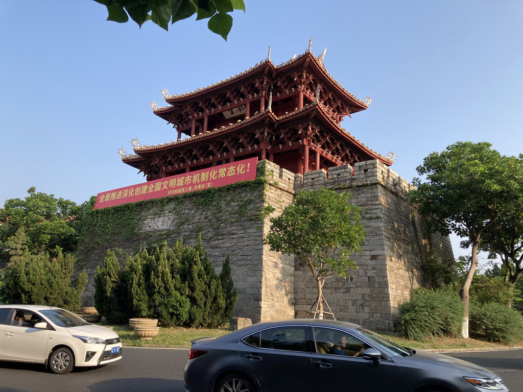 边走边看,不一会儿就会来到中山北路,这条路也是整个古城的一条中轴线,左右商铺林立,没多久右手边便是中山公园,主要建在一座几十米高的小坡上,名曰“泉山”,取道园内,山门处便有土地公宫,供人进香祈福。园内是市民休闲的好地方,有打拳舞剑的,有习武下腰的,我相信到了晚上应该也少不了广场舞。公园的尽头,一幢“威远楼”坐落,楼前一尊石狮巍峨屹立,气派非凡。再往南走百米便可见白色的钟楼,此处车水马龙,交通异常拥堵。