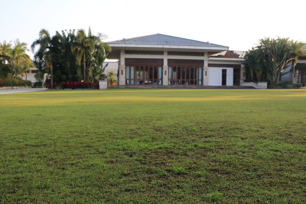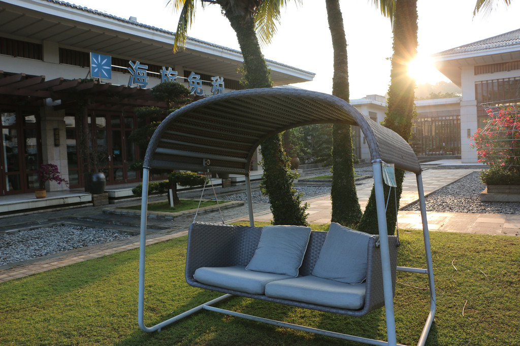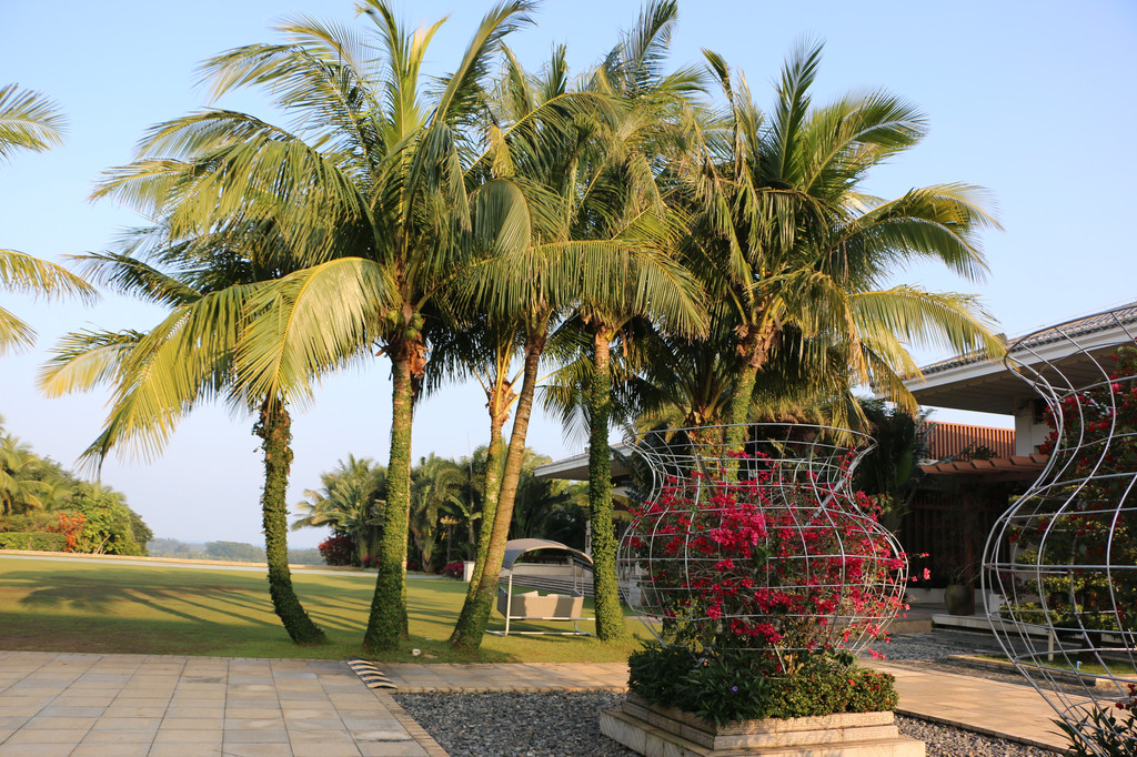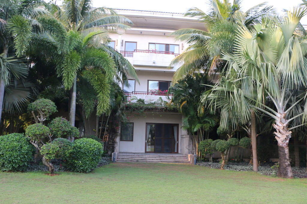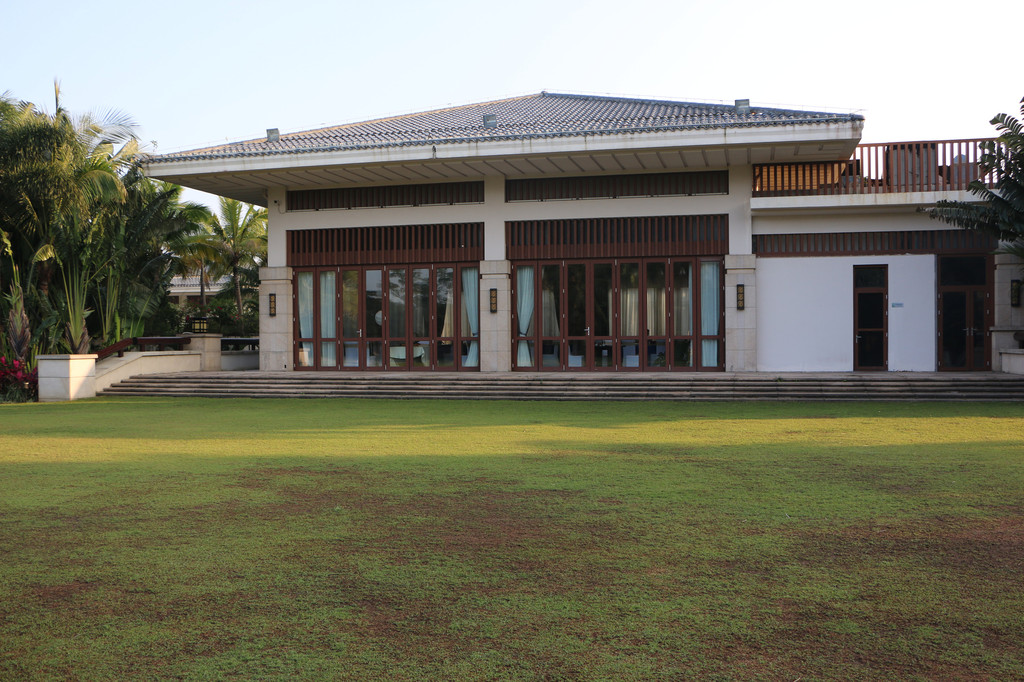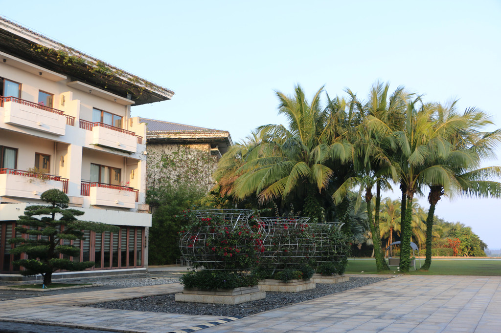 首先是高大。一是位置高,博鳌国宾馆,座落在博鳌龙潭岭主峰山麓,此处为博鳌地区最高点。二是大气,博鳌国宾馆建筑风格,很容易让人想起上个世纪五十年代北京的“十大建筑”,想起故宫,想起唐王朝的大明宫。