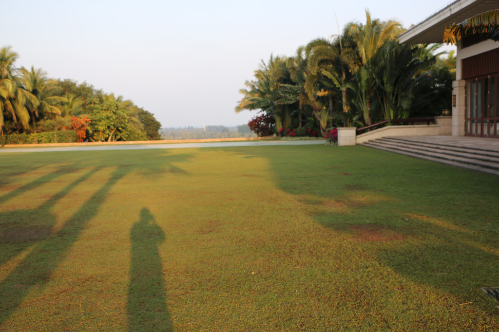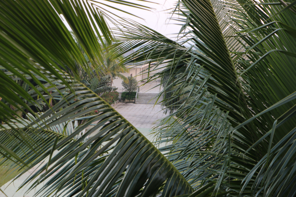 第五个词说绿色。国宾馆,椰树挺拔,绿色掩映,青草连绵,泳池碧蓝,置身其中,会情不自禁地深呼吸,洗洗肺。