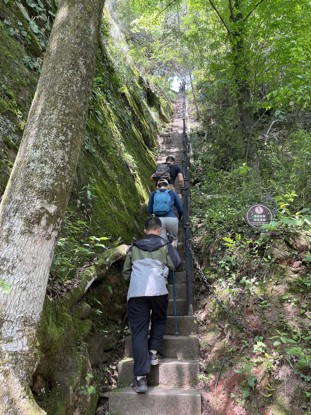 在齐云山下的望仙楼吃了个午饭,从登封桥出发开始出发徒步上山,一路九里十三亭,好像我们也没数到13个亭子,两个大男孩就在每个亭子那里等等我这个墨迹的妈妈,我的体能是全家最差的那个,平常也不怎么运动,但是呢好在我心态好,累了就自己休息调整一下,支撑我走下去的唯一的目标就是天街上的酒店。