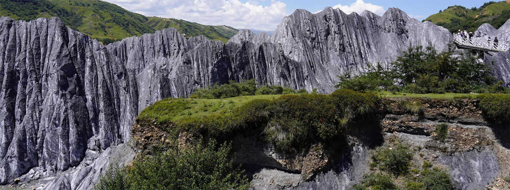 走到栈道最高处就可以看到远处出现一座座颜色奇特的石山,有的连成条状,有的独立存在。