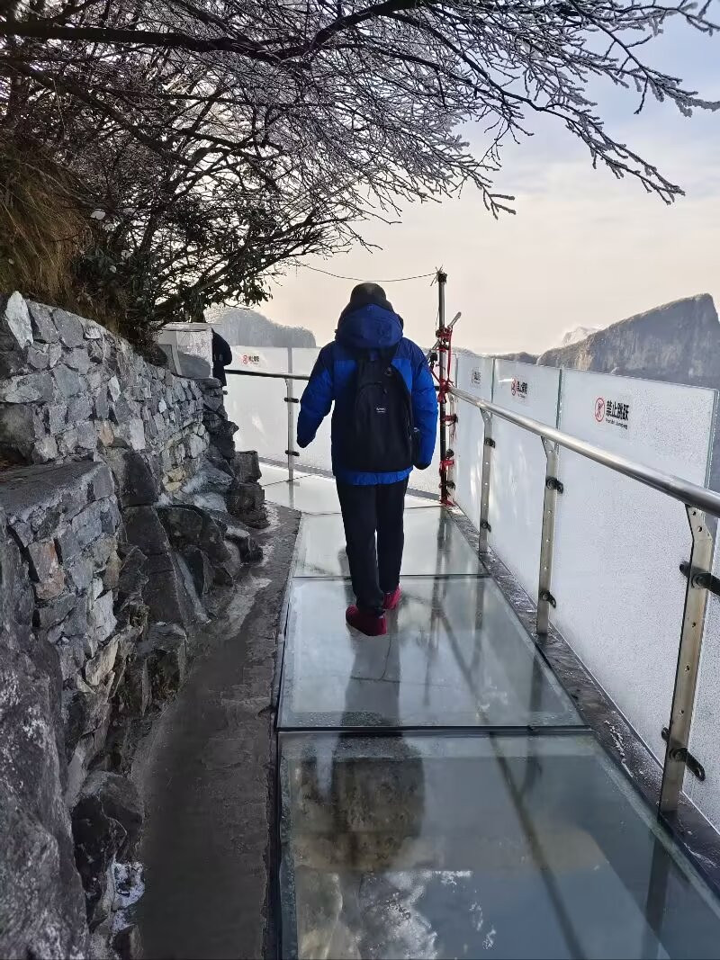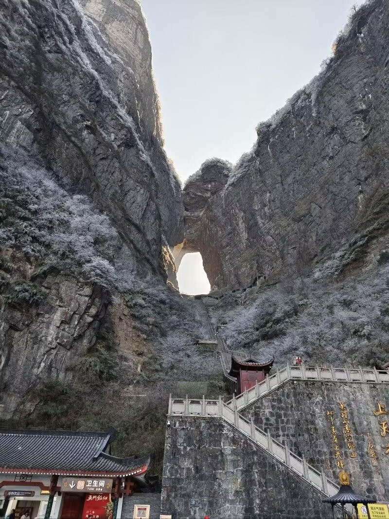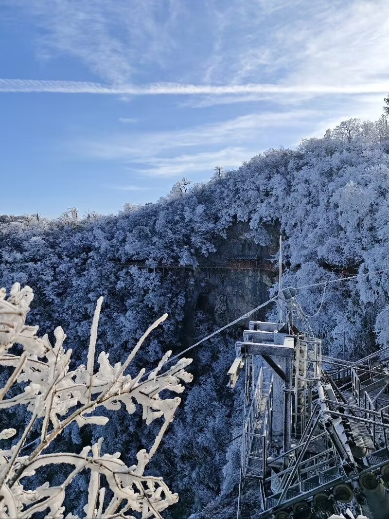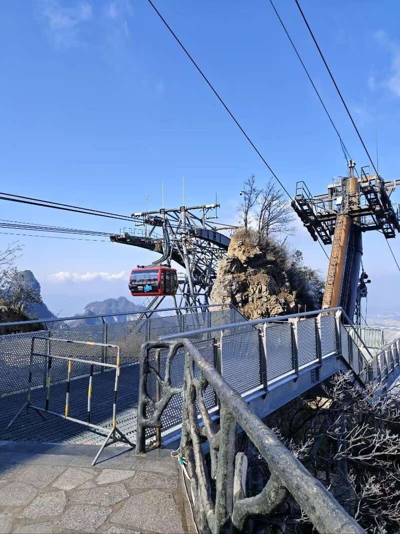 ,后来发现不行还是滑又买了一双,太逗了。仔细看脚下。第二天的行程,乘坐世界罕见,世纪一流技术,全长7455米,单程30分钟的索道游览天门山。高高的索道再加上漫山的雾凇奇观,人仿佛来到了天上如仙境一般。这条索道的建设真可谓是神奇的工程,让人不可思议。导游说这个天门山景区是私人老板承包的,包了20年,花巨资打造。