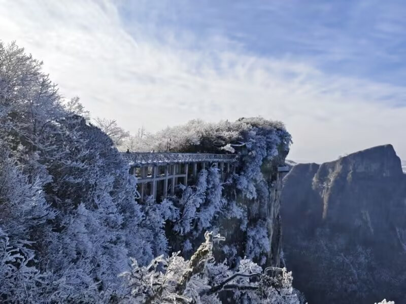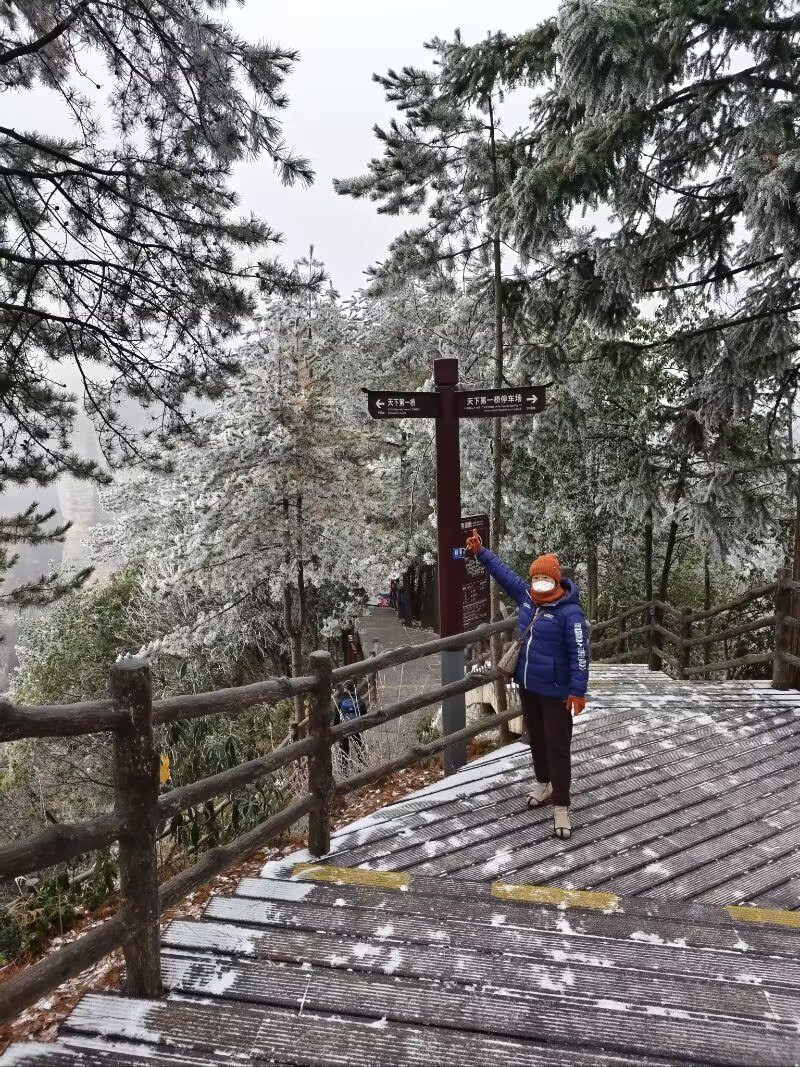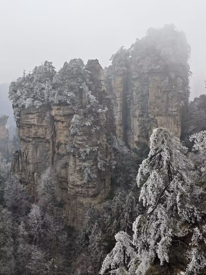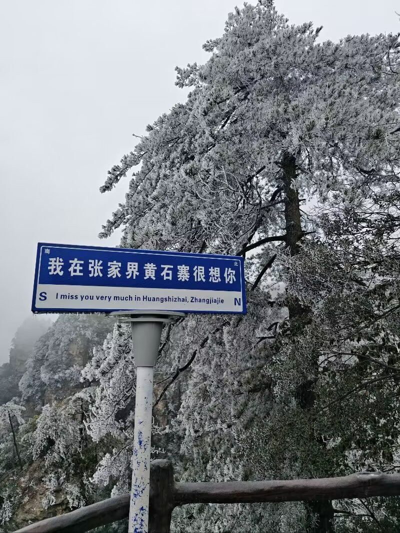 ,后来发现不行还是滑又买了一双,太逗了。仔细看脚下。第二天的行程,乘坐世界罕见,世纪一流技术,全长7455米,单程30分钟的索道游览天门山。高高的索道再加上漫山的雾凇奇观,人仿佛来到了天上如仙境一般。这条索道的建设真可谓是神奇的工程,让人不可思议。导游说这个天门山景区是私人老板承包的,包了20年,花巨资打造。