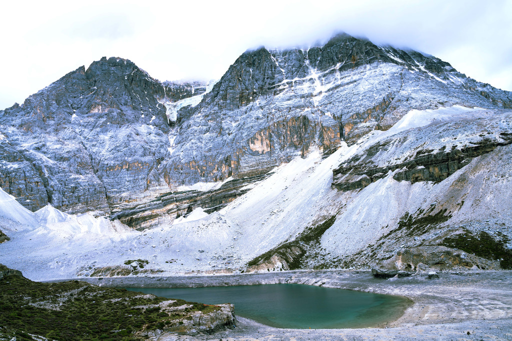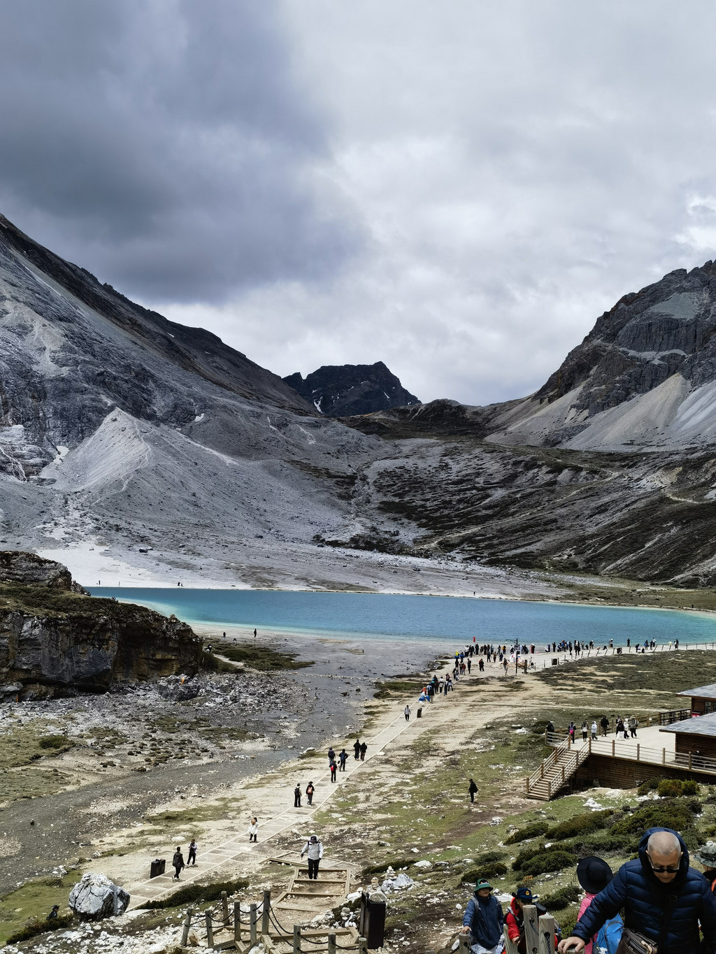 到达了海拔4600米的牛奶海,背景是雪山,河滩是白色的石头,如果是晴天,阳光掩映着清澈的湖水,宛如湖中不是水,而是新鲜的牛奶。今日天空有云,所以湖水的美丽打了折扣,好处是紫外线没有把鼻子晒脱了皮。