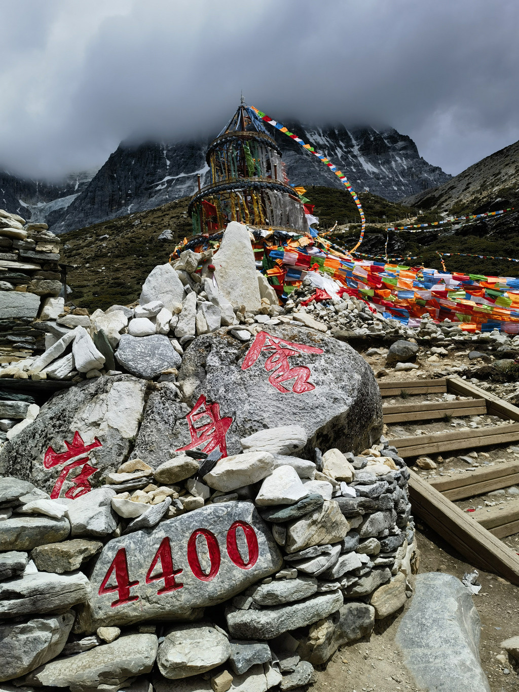 途中要翻越第一座海拔4000米以上的高山——折多山,山上很冷,需要穿冲锋衣,时不时还会下雨。