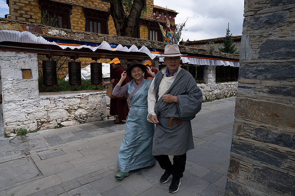 理塘县海拔4014米,是川藏南线上海拔最高的城镇,被称之为“天空之城”。到达理塘正好是午饭时间,可以在这里吃午饭。县城里有个勒通古镇,是藏式风格的旅游景点,有时间可以去看看,我们是回程的路上玩的。古镇内有穿藏服的旅拍,有各种藏式特色美食。很多都是网红服装。我们没用,而是租用了藏族饭店店主自家的服装,虽然没有舞台服装那么艳丽,胜在原汁原味。