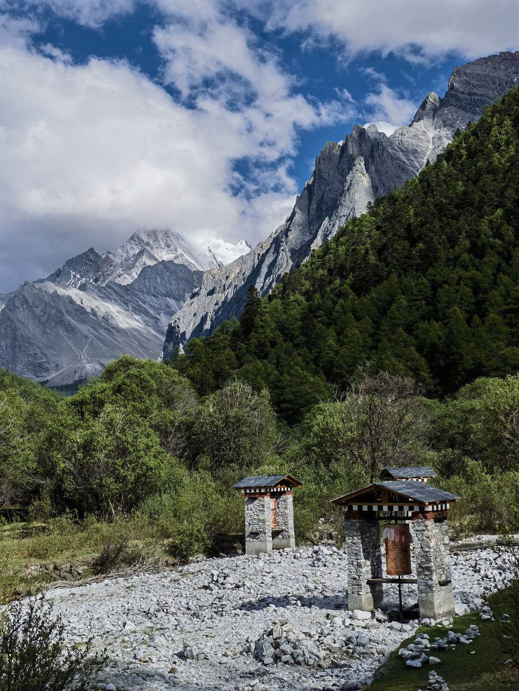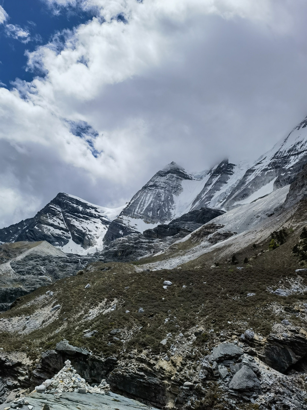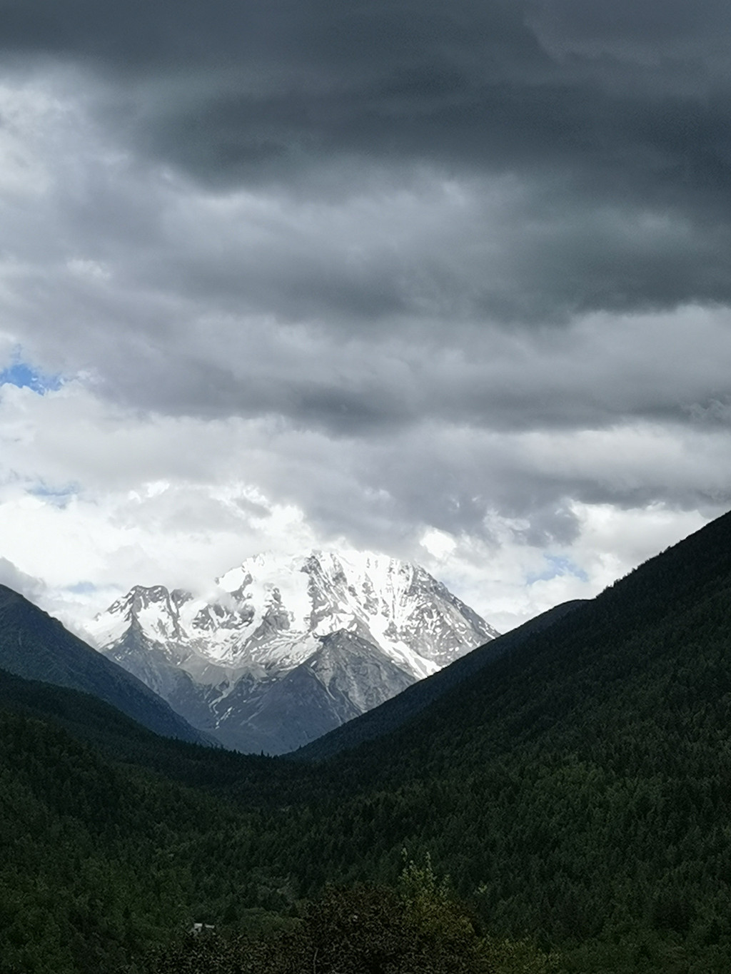 回望央迈勇,距离更近了,山峰间冰川看得非常清晰。