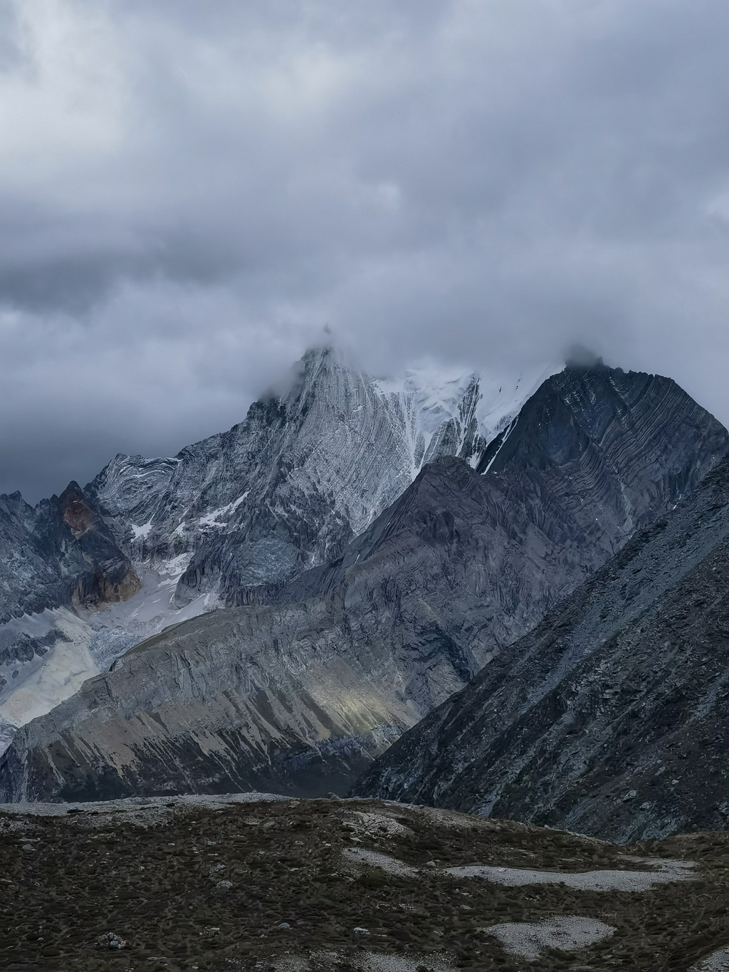 最后的300米路程是从海拔4600米的牛奶海爬到海拔4700米的五色海。比较陡,需要慢慢走,对面的雪山应该就是夏诺多吉。岩石呈现出美丽的条纹。