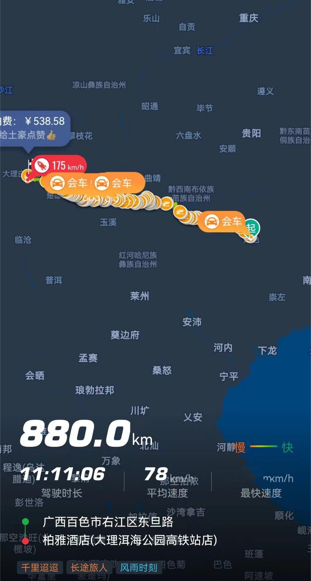 说一下我的车,19年落地的18款的雷凌纯油1.2T,目前行驶了15万多公里了。在此之前其实有三种方案,一是开自己的车全程自驾,二是租台特斯拉全程自驾,三是高铁到大理租车自驾,考虑了成本,且涉及行程中可能遇到的保险及违章问题问题,决定还是开自己的车比较保险。满载5人加上行李,这一程估计能干个四五千公里了。