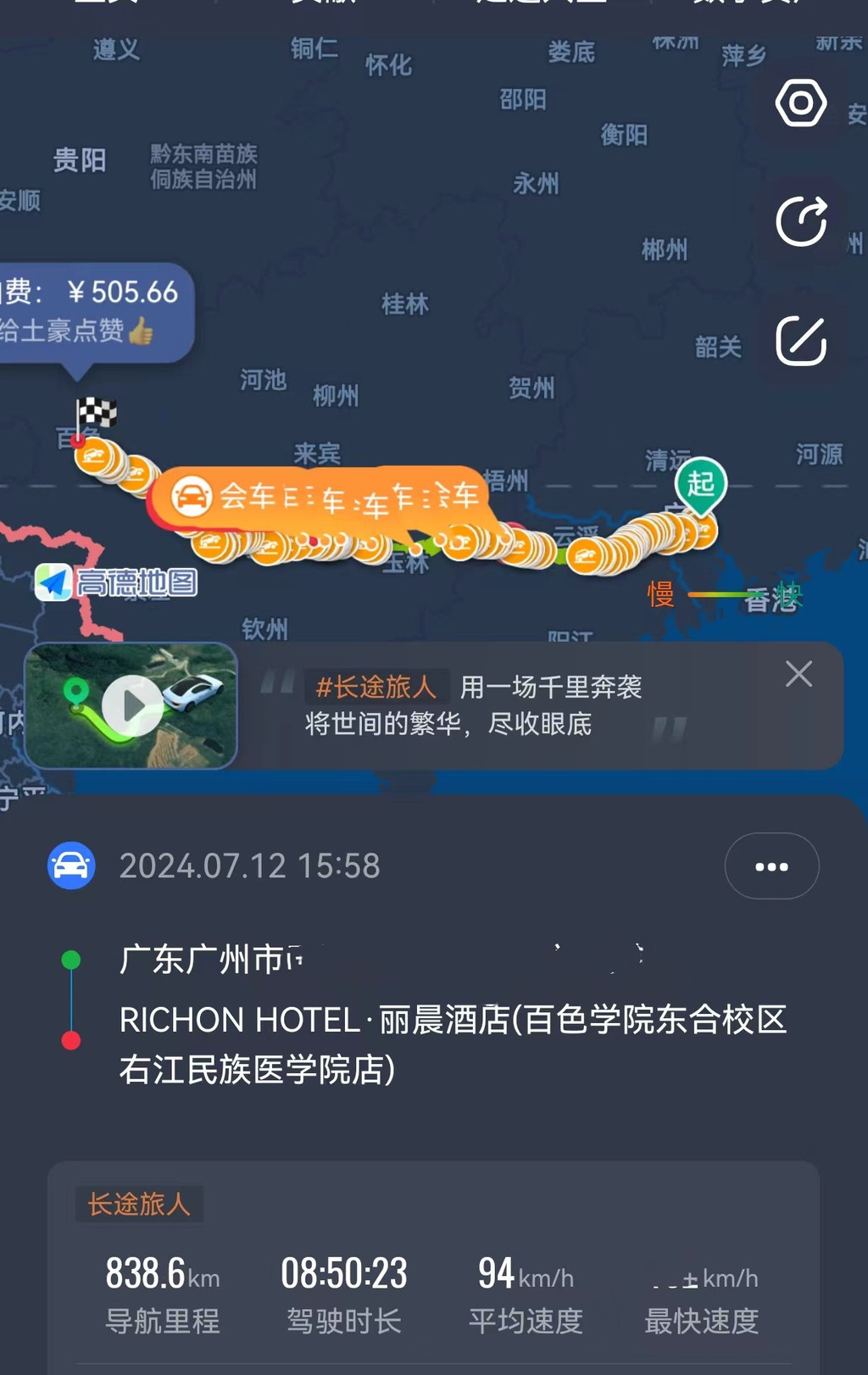 晚上十二点多到达,中途停了两次服务区,加了一次油。走的是云浮那边过,好处是进广西后测速会少一点,可以开快一点,还有就是广西很多隧道都不需要减速,开起来还是相对比较轻松。