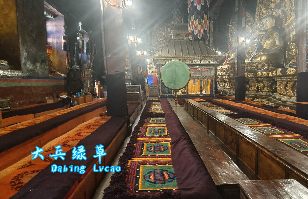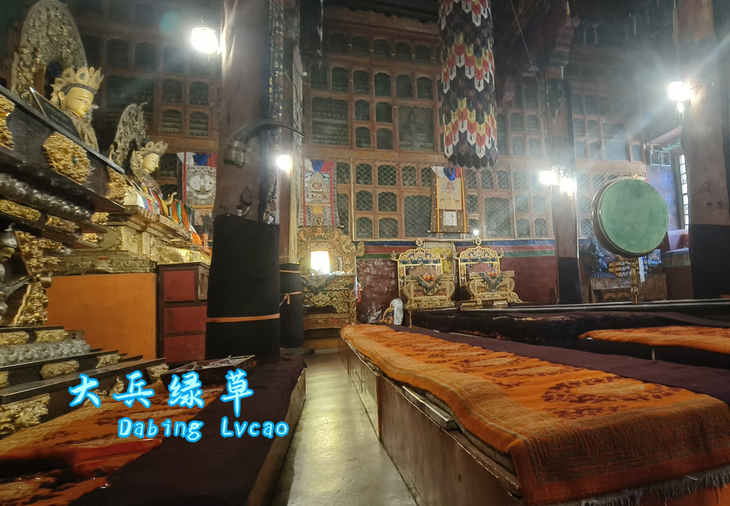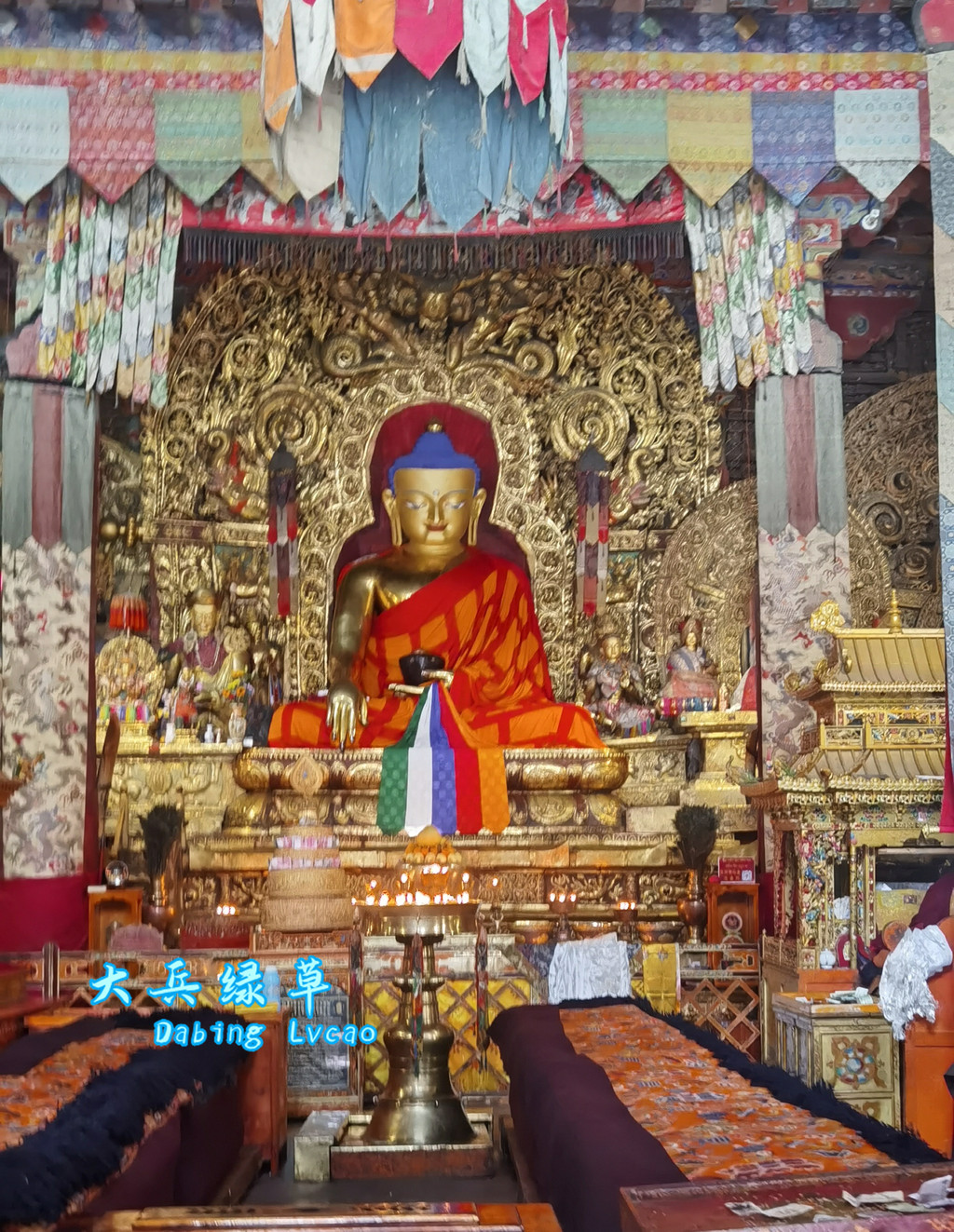 内廷正面是大雄宝殿,大殿里的布置与一般的藏传佛教的大殿也不一样,这里的大殿宽度很宽,深度方向不深。