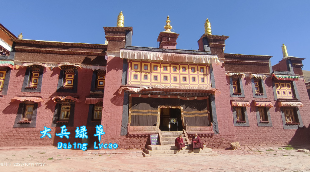 侧面的慈钦拉康门前,坐着两位僧人在悠闲地聊天。