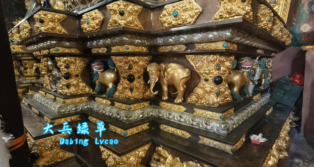 这尊萨迦派第一祖——萨钦·贡噶宁波塑像的底座显得尤为尊贵华丽。