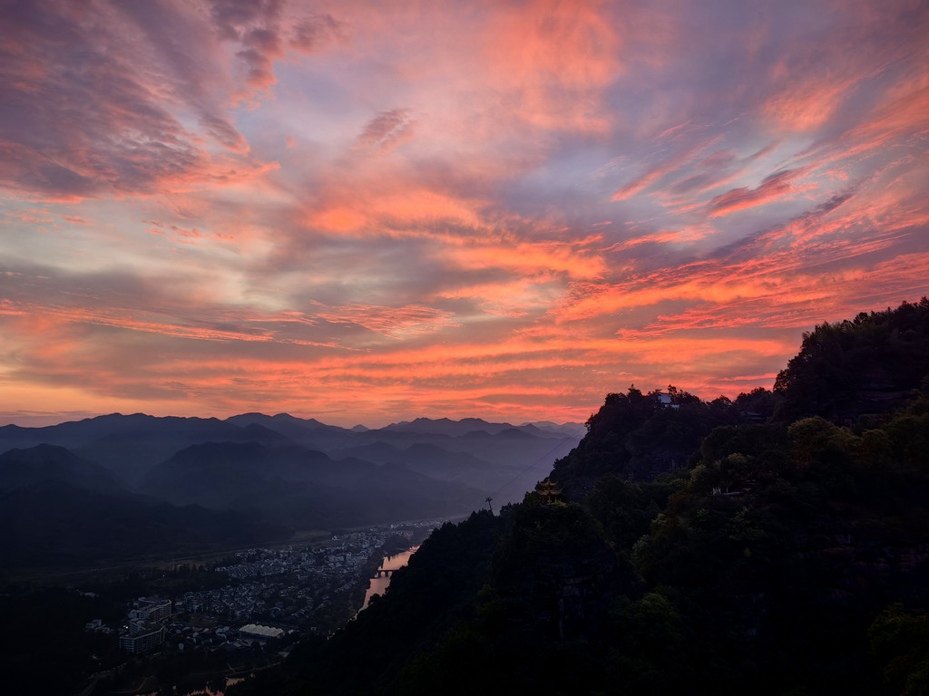 印象比较深刻的一处景点是一个叫做“海天一望亭”,重修于上世纪80年代中期,顾名思义,此亭的位置是齐云山云海的分界,海拔约370米,背倚白岳峰,西朝黄山,下临横江河谷,每当云海生成,宛如从足底涌起,远处山峦似仙岛般出没无常,犹如隐现于“海涛”之中。恰值旭日东升,金光万道,白云怒涛,仿佛云天一色,海天相接,蔚为壮观,让我想到两个英文词“spectacular”“splendid”。