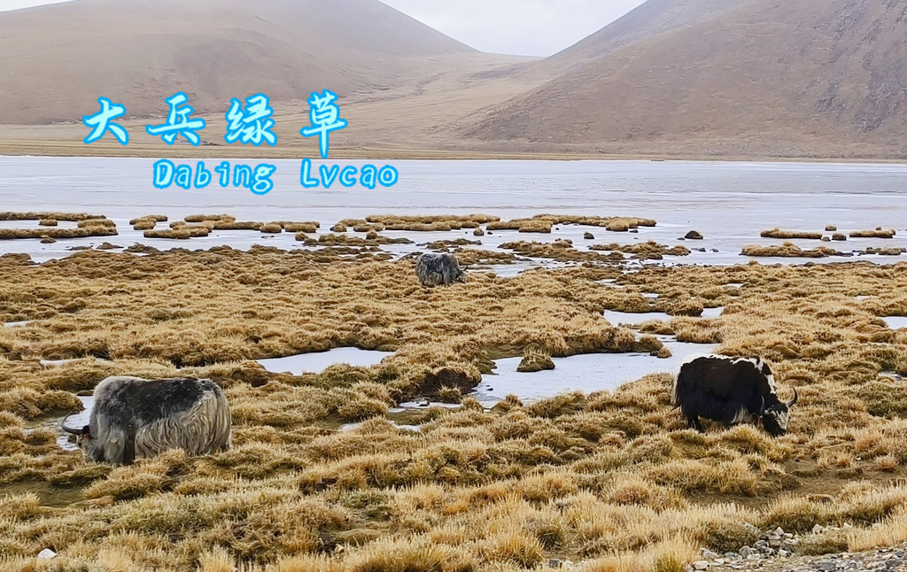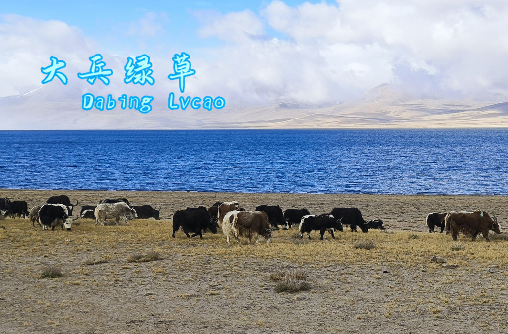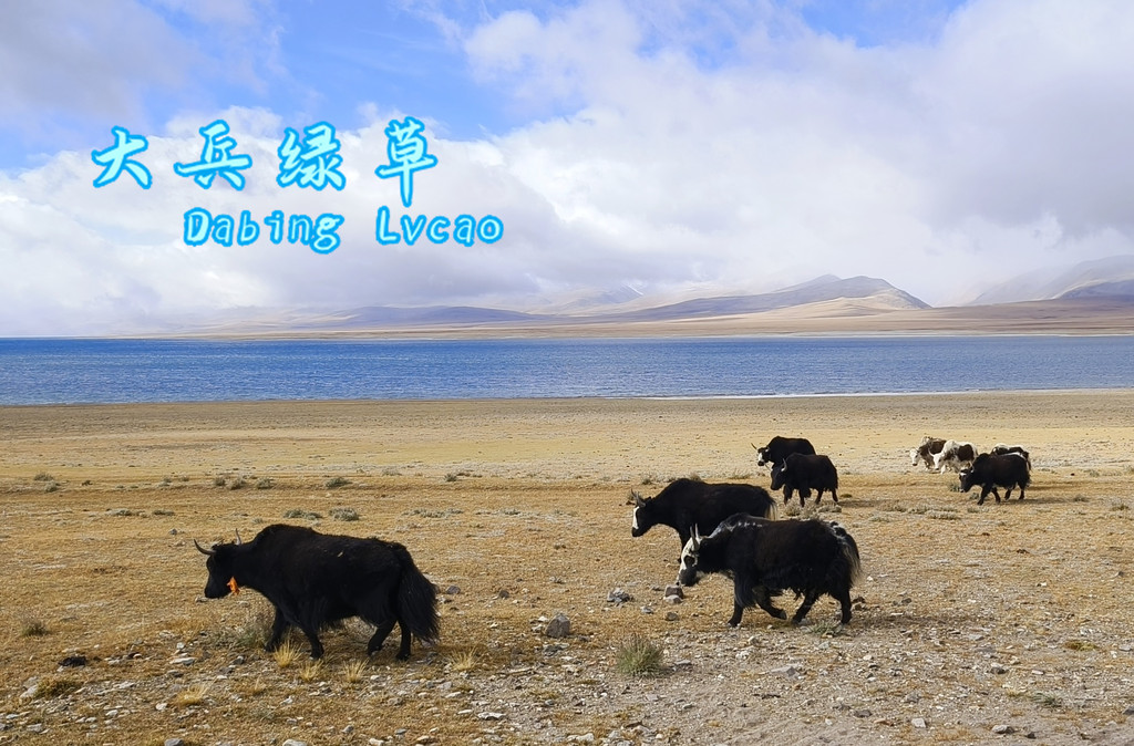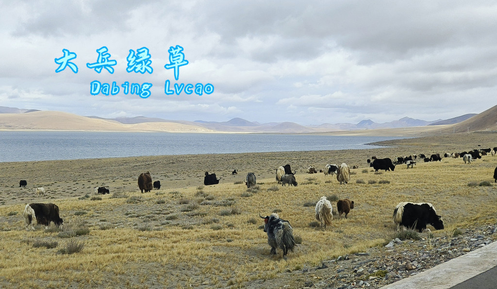 阴沉的乌云笼罩着天空,湖水也失去了靓丽的色彩,这边还有牦牛在吃草。