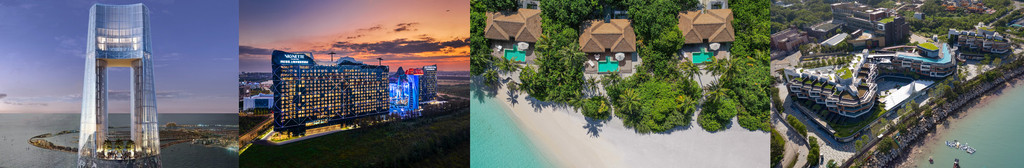 从左至右依次为:洲至奢选迪拜Ciel Tower酒店、洲至奢选上海冰雪世界酒店、洲至奢选马尔代夫诺库度假村、洲至奢选香港WM酒店