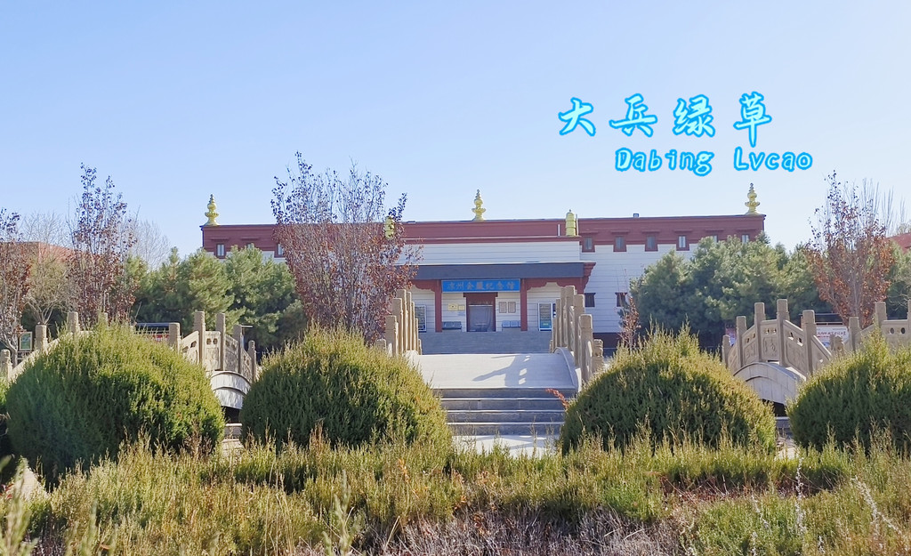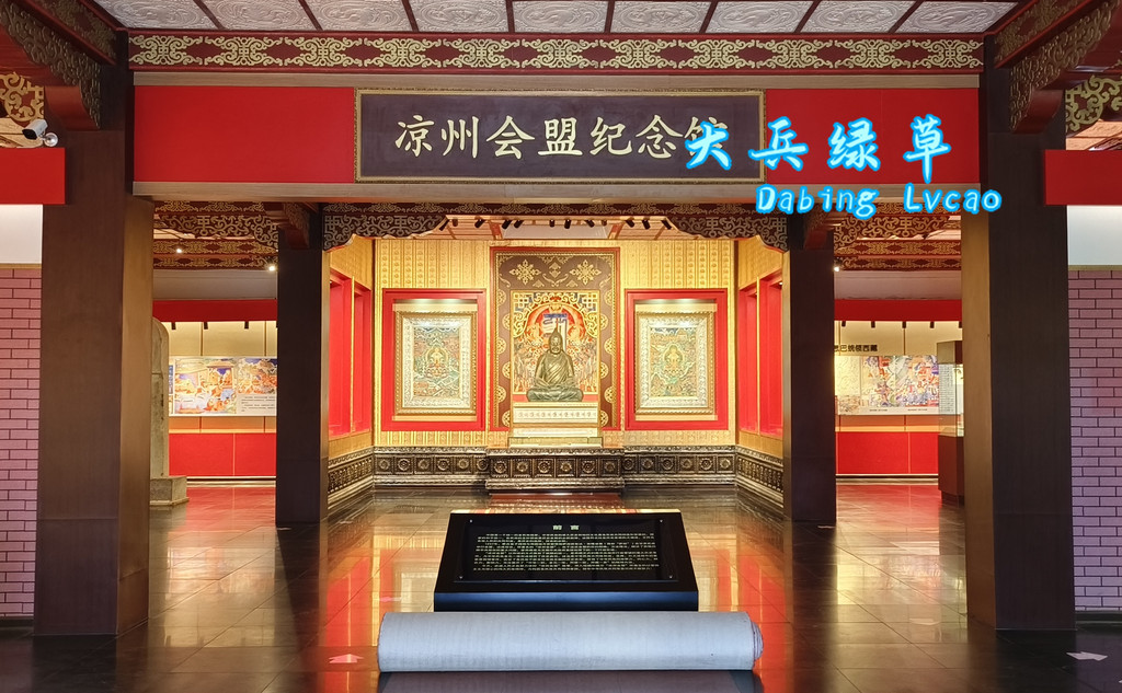 在塔林的南侧是凉州会谈纪念馆,馆内通过图片、文字、实物以及多媒体展示手段,详细介绍了“凉州会谈”的主要人物、历史背景、会盟过程,并展出了与此有关的白海螺、原灵骨塔构筑物等文物。