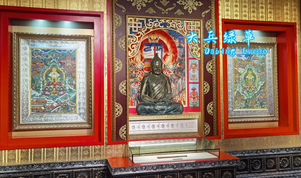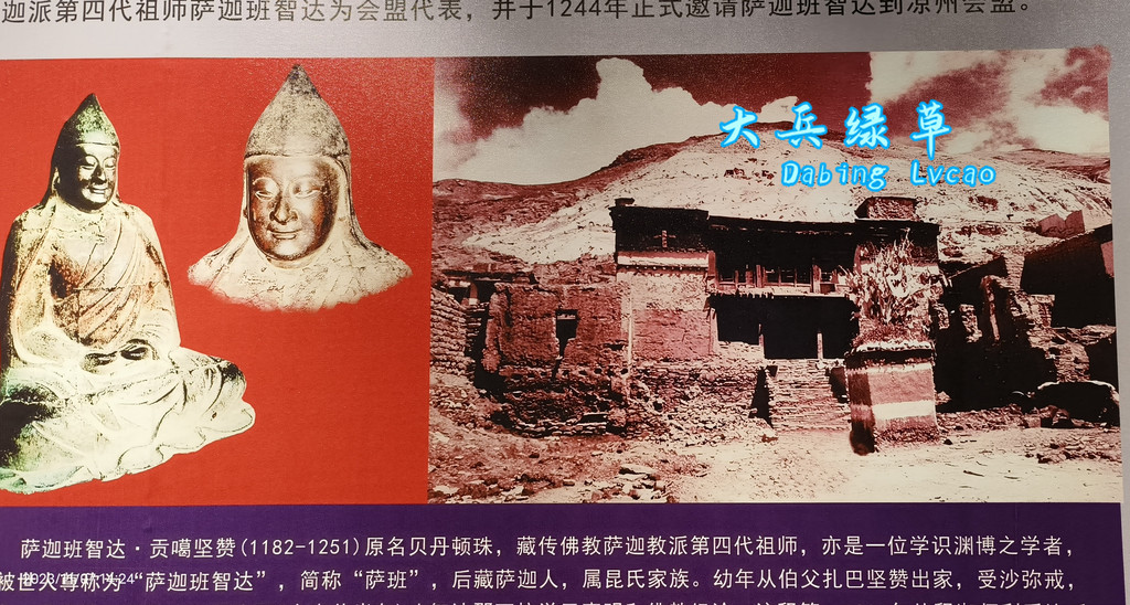 进入景区后,一座金色的萨迦班智达・贡嘎坚赞塑像树立在高台上,完整地表现了后人对他的崇敬。1244年萨迦班智达・贡嘎坚赞接到阔端的邀请诏书后,不顾年事已高(时年 63 岁)和路途遥远艰险,毅然前往凉州,沿途与西藏各方沟通、协商,为后来的归顺奠定了基础。1247年凉州会盟、向吐蕃各地发出《萨迦班智达致蕃人书》后,萨迦班智达・贡嘎坚赞一直在凉州致力于巩固吐蕃与蒙古之间的关系,推动双方在政治、经济、文化等方面的交流与合作,直至1251年在凉州圆寂,他为吐蕃与蒙古的友好关系以及西藏纳入中国版图所做出的贡献永载史册。