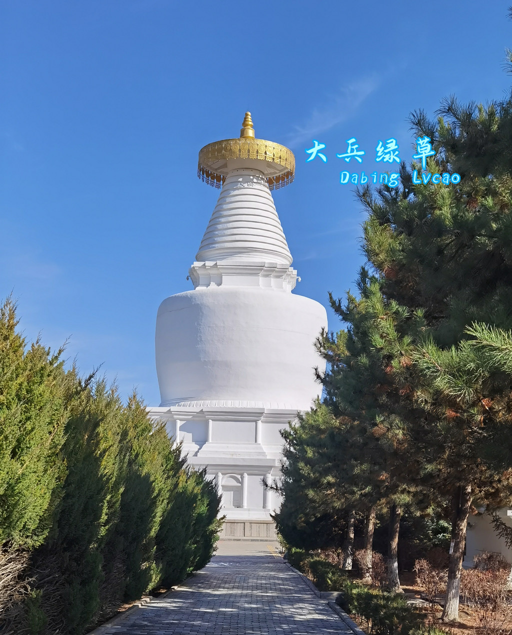 萨迦班智达・贡嘎坚赞金色塑像后面是白塔林,数十座大小不一、塔身洁白,造型庄重优美的白塔围绕着中央一座塔高19 米、雄伟高大的萨迦班智达・贡嘎坚赞灵骨复原白塔。