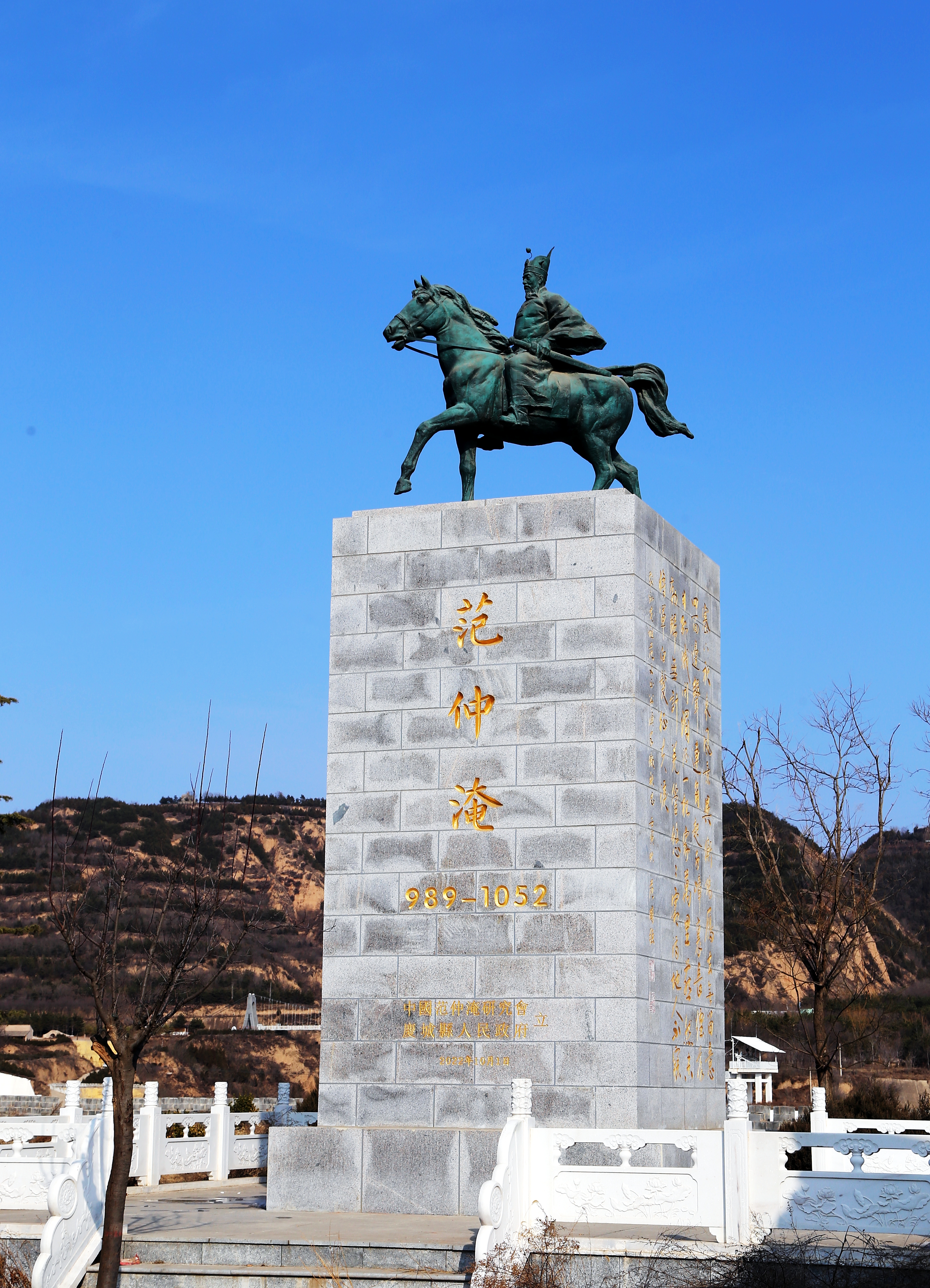 庆州古城永春门内的广场上矗立着范仲淹青铜塑像。石材基座上范公策马出征,从一个侧面展示了范仲淹戎马一生戍守西北并知庆州、延州的丰功伟绩。花岗岩底座正面的“范仲淹”名字和南面的范仲淹名词《渔家傲·秋思》以及背面的《范文正公戍边文》均出自中国范仲淹研究会会长范国强之手,雕塑基座北面“先天下之忧而忧、后天下之乐而乐”则由范仲淹二十八世孙、著名新闻人范进宜题写。