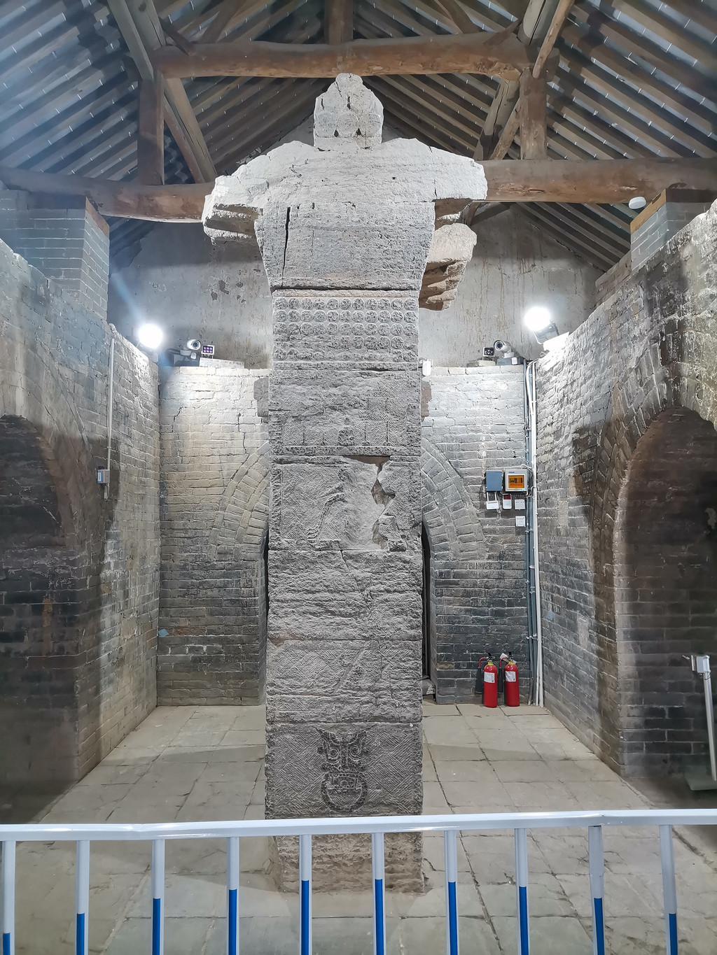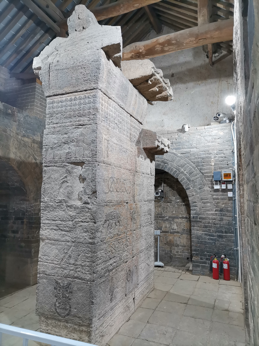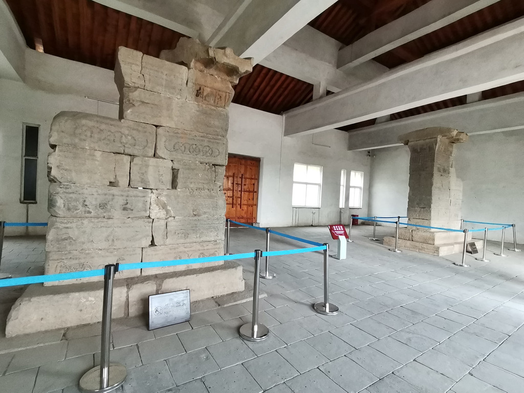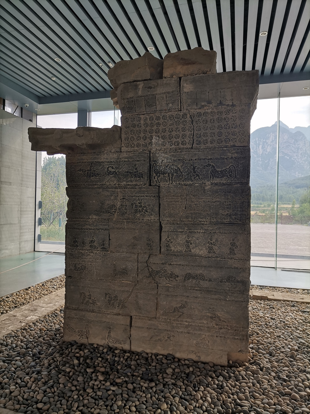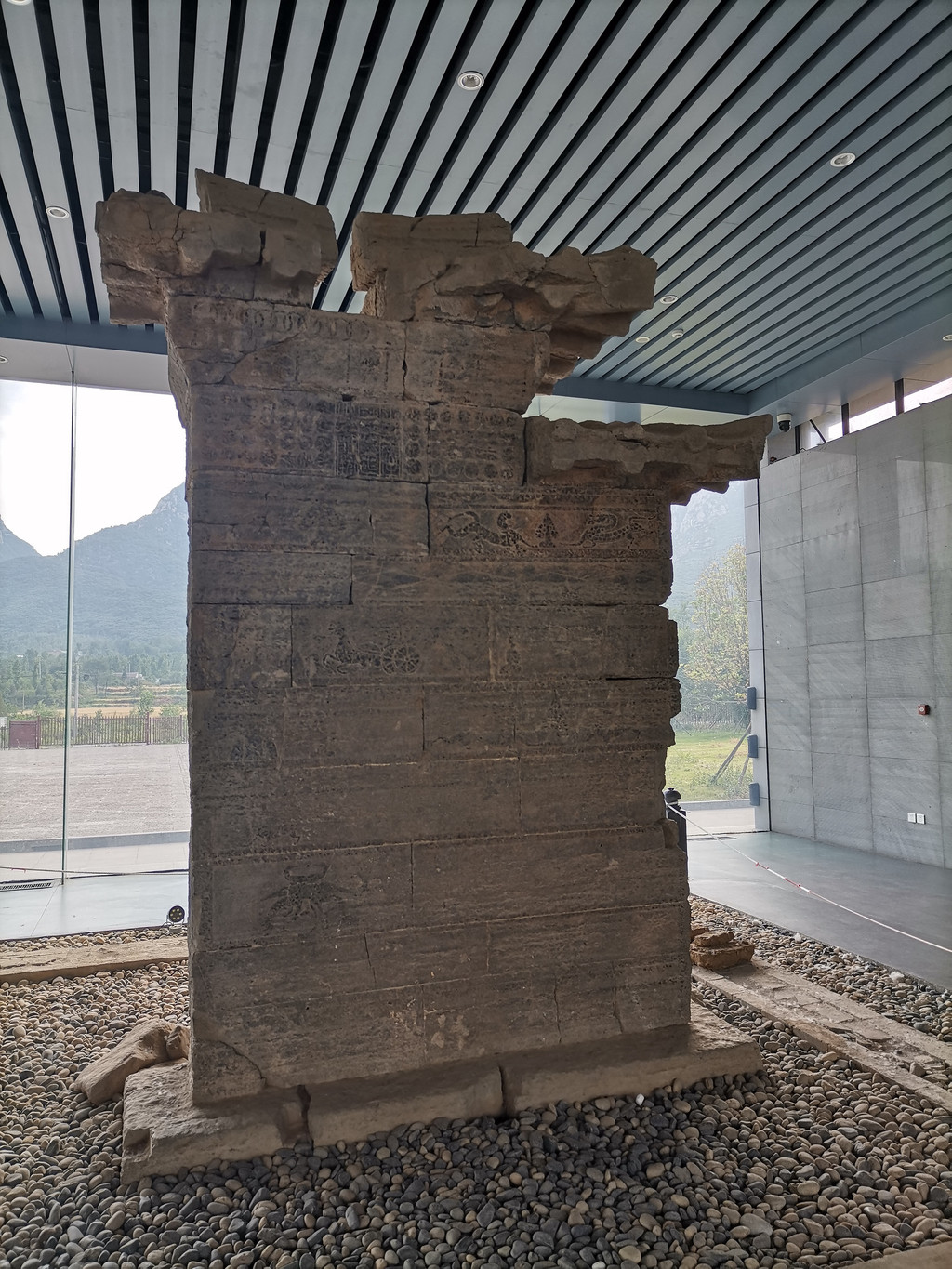 作为国家首批重点文保单位当中的002号古建筑,它建于东汉安帝延光二年,公元123年,属子母阙,阙体高约四米,两阙间隔近七米,用方正的石灰石叠筑而成。阙体表面的文字,因年代久远,所余不多,却是中岳汉三阙中图案最为清晰的一处。剩余的60余幅刻象中,有驯兽图,蹴踘图,拜谒图,狩猎图,青龙自虎图,交龙车马出行图,鹭鸟食鱼图,斗鸡图,比翼鸟,奔鹿图等,图案多用减地平雕的手法,线条精炼,兼具写实与写意之美,典型的反映了秦汉时代石刻造像的雄劲大气。